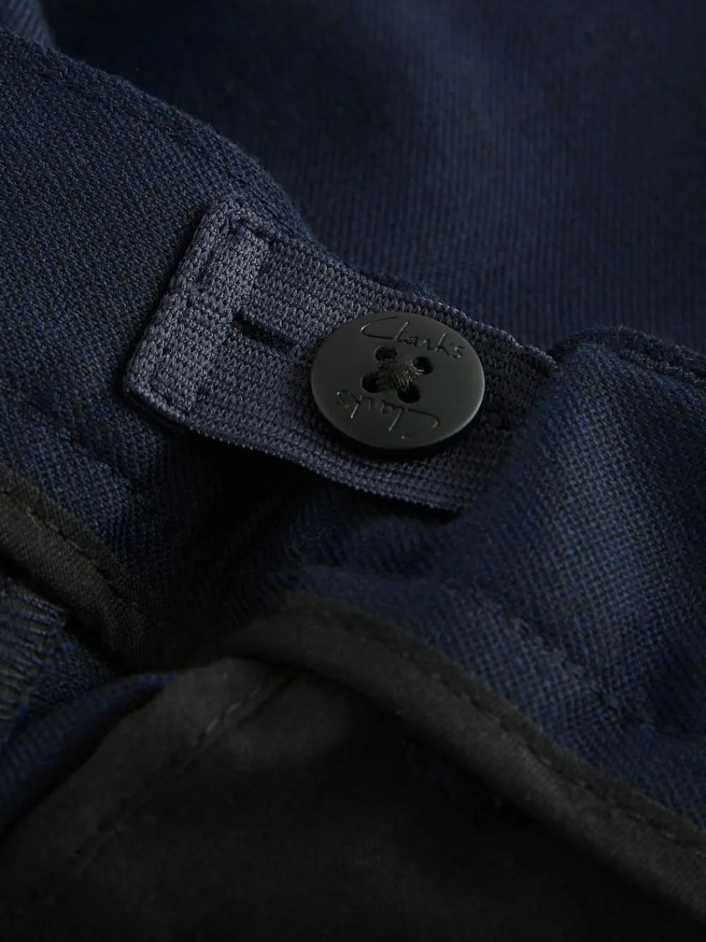 Update his school wardrobe with these smart slim fit trousers from Clarks. Designed with a fastening waist, they are fitted with internal waist adjusters and have an added interlining at the knees for extra durability. The trousers also have grow with me hems so they can wear them comfortably throughout their school years. The trousers are machine washable and are finished with Teflon that repels water-based stains and dries quickly. 64% Polyester, 34% Viscose, 2% Elastane. This product is made with teflon. Teflon® is a registered trademark of DuPont., Machine Washable , These products have an adjustable waist, achieved by using the button holes in the elastic and a concealed button on the inside of the waistband.