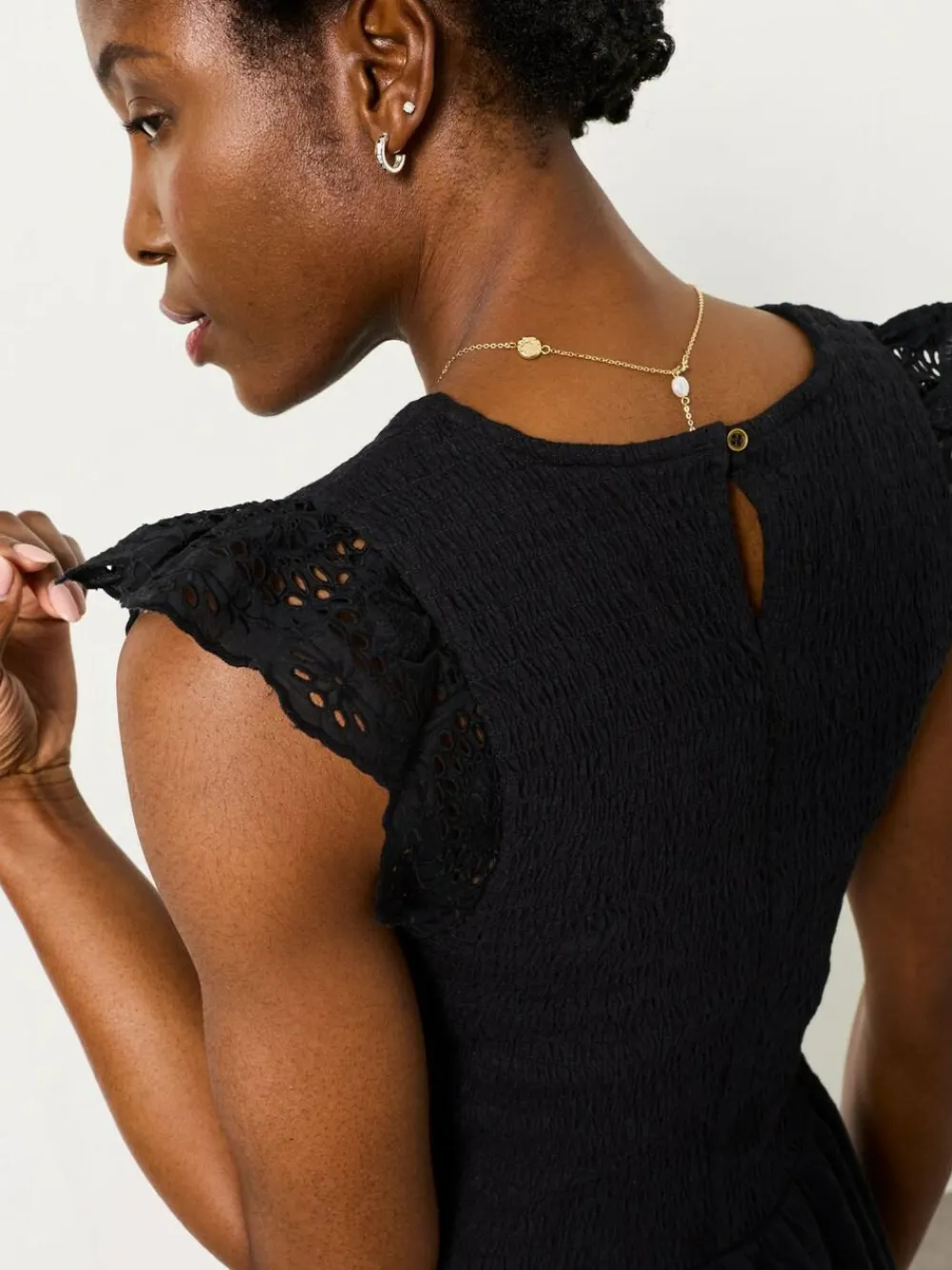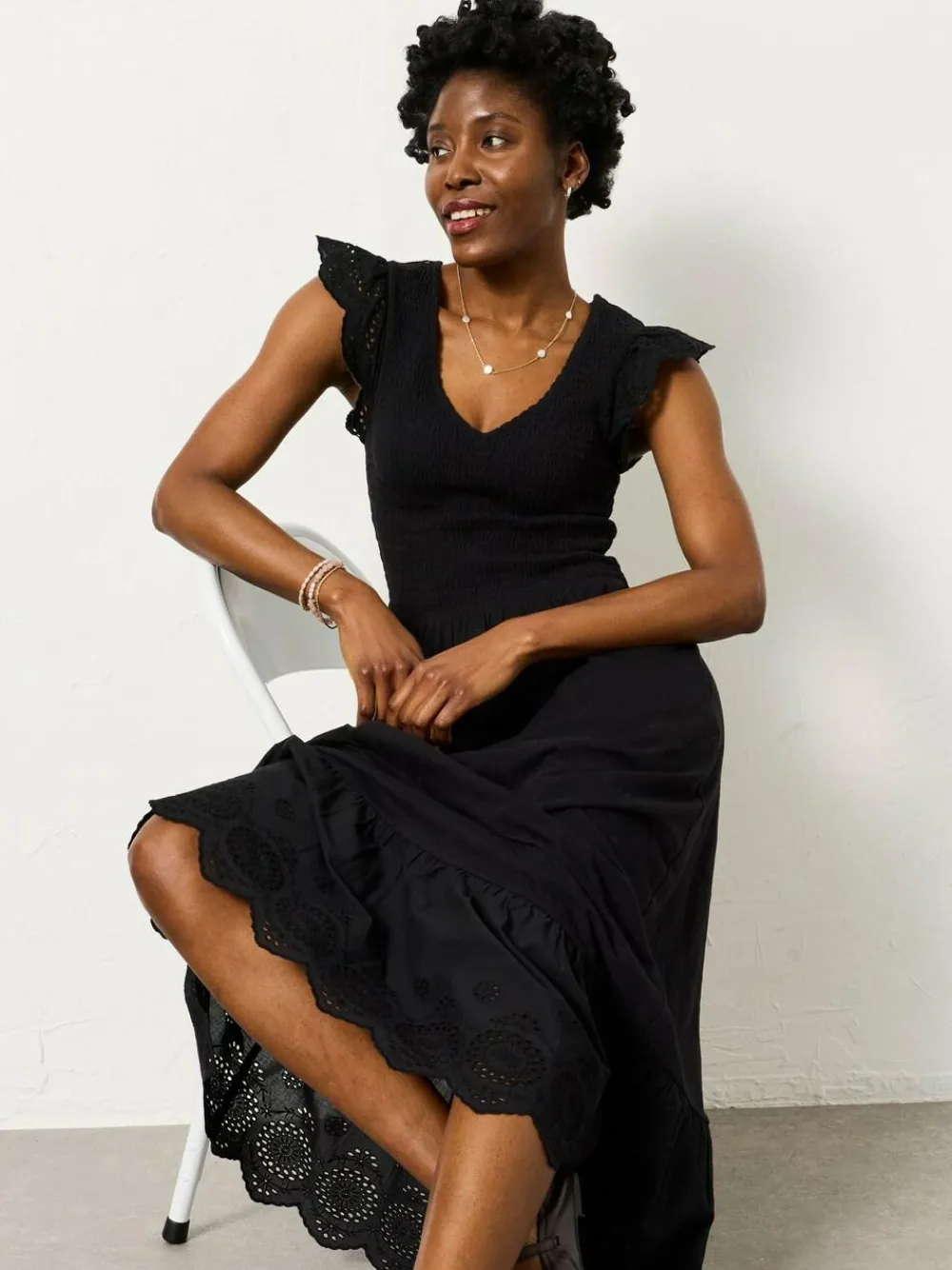 The Demi jersey midi dress features scalloped short sleeves with subtle cut-outs and a matching cut-out hem for a beautifully finished look. Made from soft jersey with a flattering fit, it’s perfect for sunny days, weekend plans, or dressing up with sandals for an easy evening outfit. Petite side neck to hem 51″ / 130cm. Machine washable. Main 100% Cotton. Panel 100% Cotton. Embroidery 100% Recycled polyester.