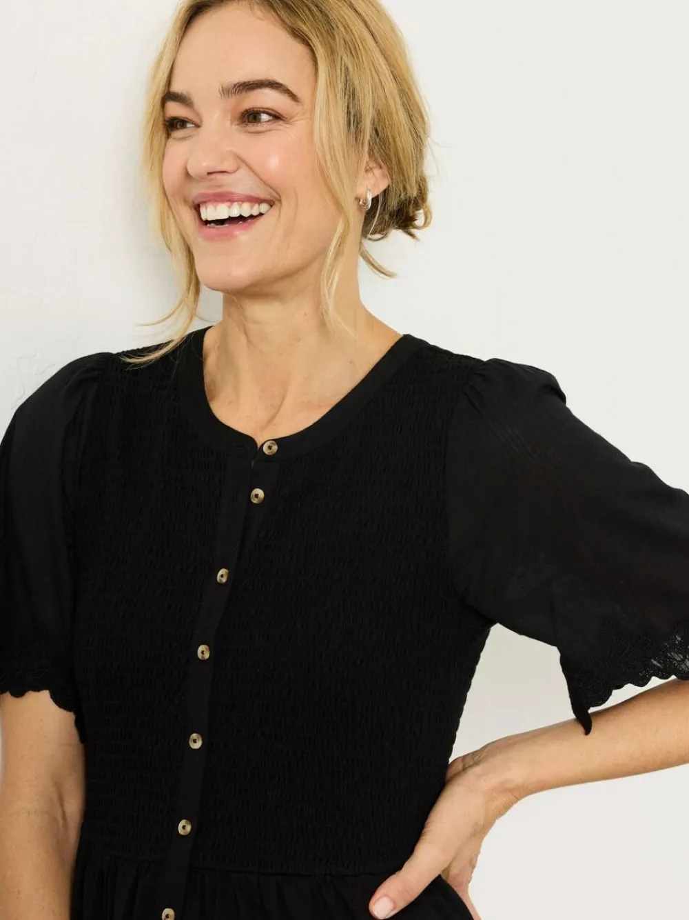 Our Fleur midi dress features a smocked bodice for a flattering, flexible fit and a smooth A-line skirt that flows with ease. The short sleeves are finished with scalloped lace trim for a soft, detailed touch, while the button-down front adds a classic feel. Crafted from lightweight and breathable jersey fabric, it’s an effortless choice for warm-weather plans – just add sandals and go. Regular side neck to hem 45.5″ / 115cm. Machine washable. Main 95% Cotton, 5% Elastane. Panel 100% Cotton. Embroidery 100% Recycled polyester.