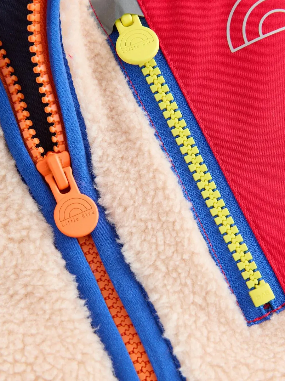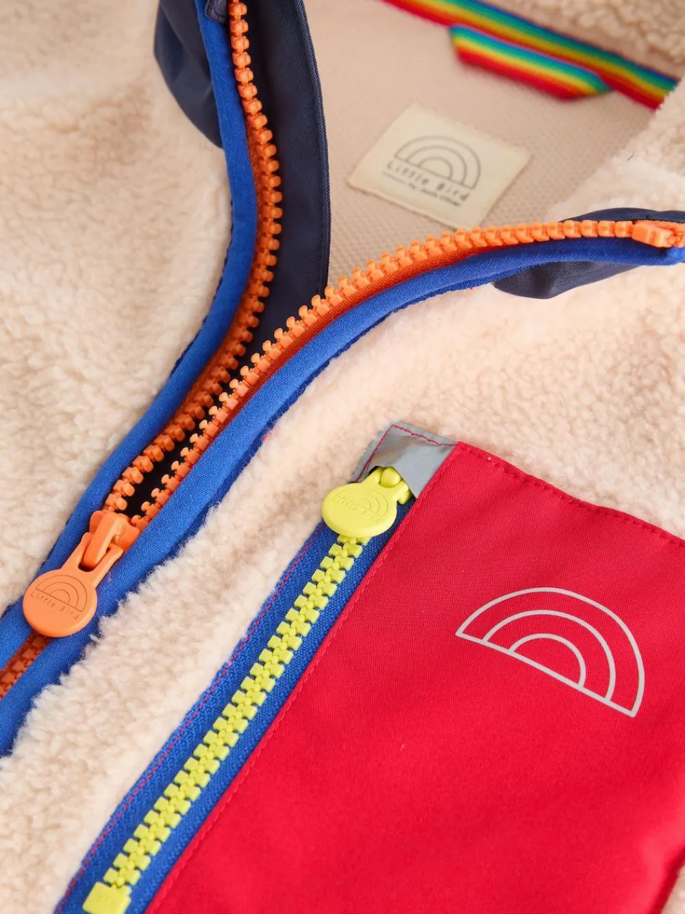 Crafted for curious hearts and fearless adventurers, this cosy cream jacket is your ticket to discovery. With a bold red adventure pocket for secret treasures and contrasting bright green and electric blue side pockets for stashing snacks or maps! This isnt just a jacket its a mission uniform.Whether youre scaling backyard mountains, charting new galaxies in your imagination, or just chasing the sunset, the Explorers Fleece keeps you warm, wild, and ready for anything. Main 100% Polyester. Trim 100% Recycled polyester.
