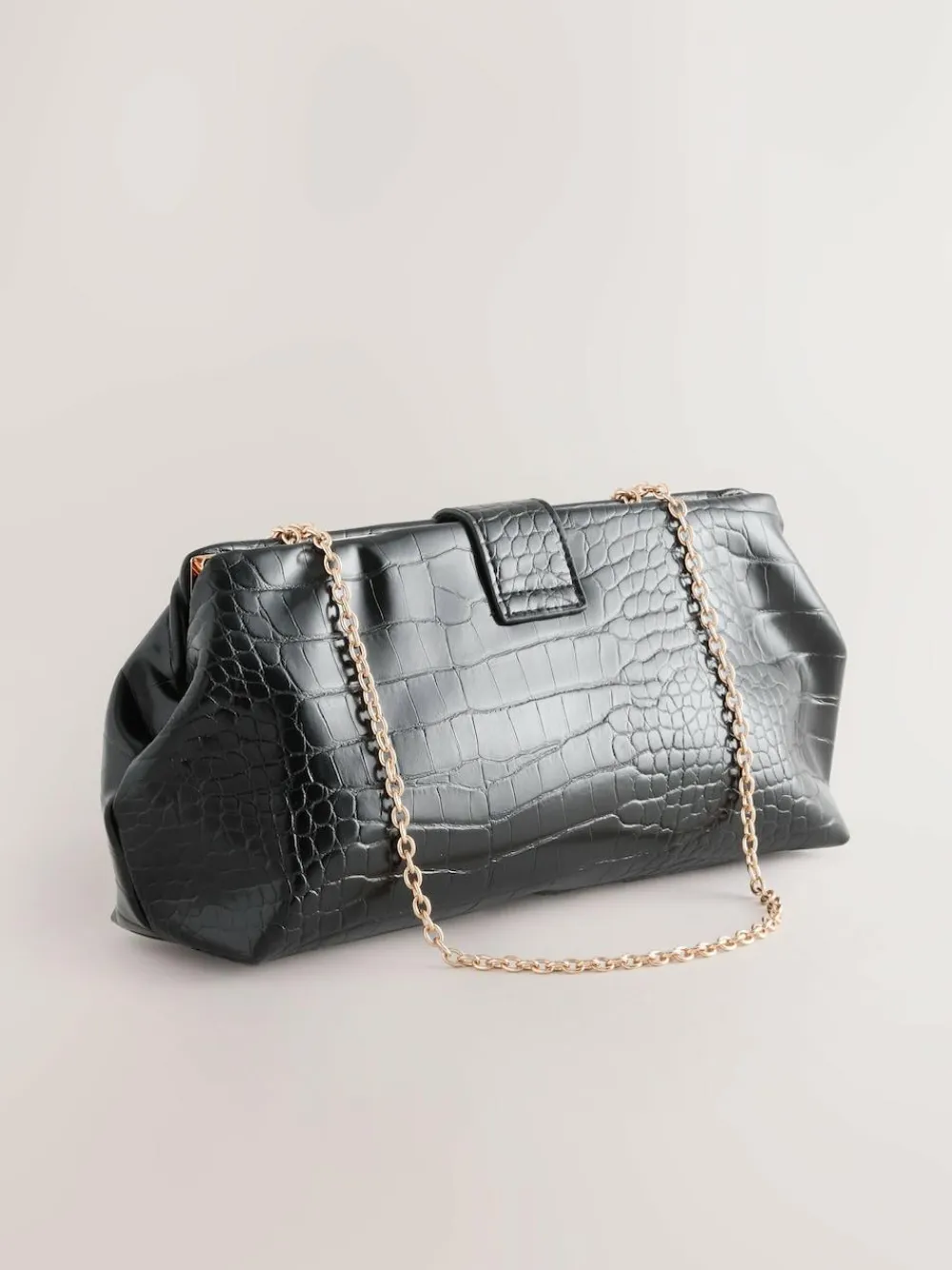 Complete your evening look with this black croc-effect clutch bag. The PU material and stylish croc print offer a luxurious texture and a modern feel, while the sleek shape makes it the perfect accessory for a night out or a special occasion. For versatile wear, it comes with an optional gold-toned chain strapCroc-effect print PU material Optional chain strap Snap closure Structured clutch bag Height 13cm Width 25cm Depth 7cm Outer 100% PU. Lining 100% Recycled polyester.