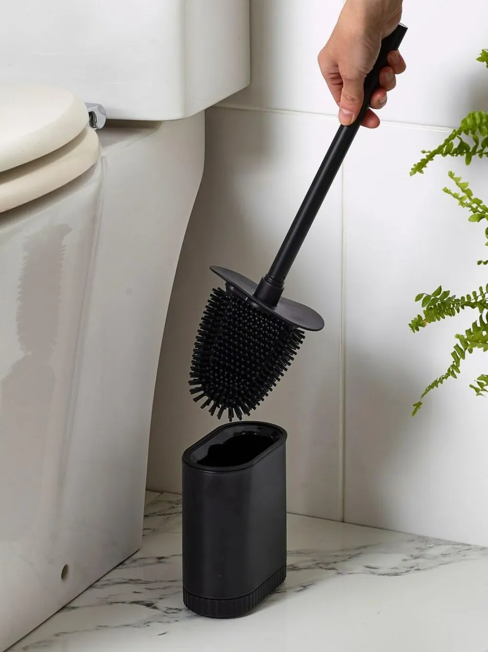 Our black silicone toilet brush is designed to be sleek and slimline and is a must-have staple for any bathroom. Slimline shape Silicone construction Perfect for any bathroom 36% Silicone, 32% Metal, 23% Plastic, 9% Stainless steel. This item has been tested to ensure it is bathroom suitable and protects against corrosion and distortion from steam.