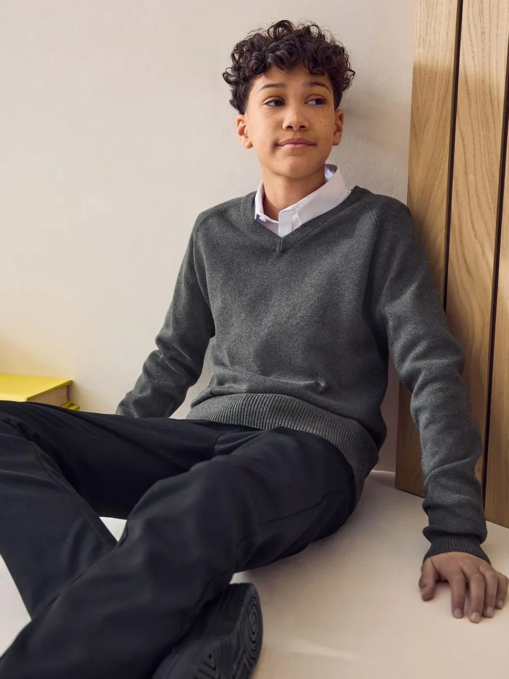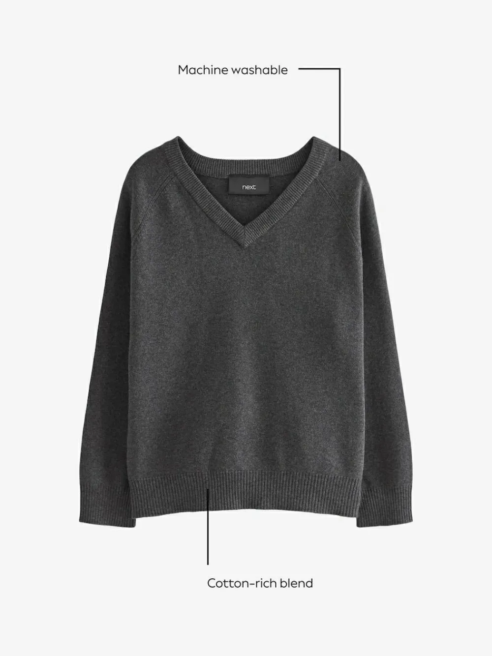 Send them to school in style in our knitted V-Neck school grey jumper. Crafted from a soft cotton blend, this cosy and smart black jumper is complete with a v-neckline, ribbed cuff and hems and long sleeves. The perfect piece for layering over a shirt, this jumper will complete their uniform nicely. Key Features: Cotton-rich blend Ideal for layering V-neckline Ribbed cuff and hems Long sleeves Machine washable. 82% Cotton, 18% Nylon.