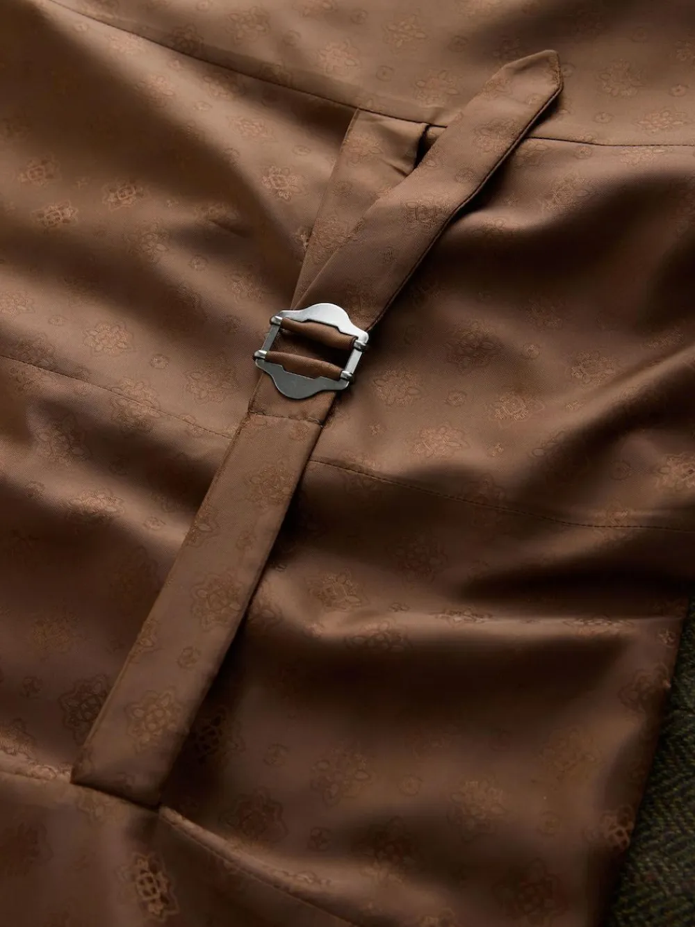 An essential for a formal or smart-casual look, this green wool-blend waistcoat is a timeless piece for your wardrobe. The sophisticated herringbone pattern adds a classic feel, while the elegant six-button fastening and buckle adjuster at the back provide a smart and comfortable fit. It is finished with a luxurious jacquard lining for a polished feel. Wool-blend fabric Herringbone pattern Six-button fastening Buckle adjuster Jacquard lining Main 65% Recycled polyester, 32% Recycled wool, 3% Acrylic. Inner Lining 65% Polyester, 35% Cotton. Outer Lining 100% Recycled polyester.