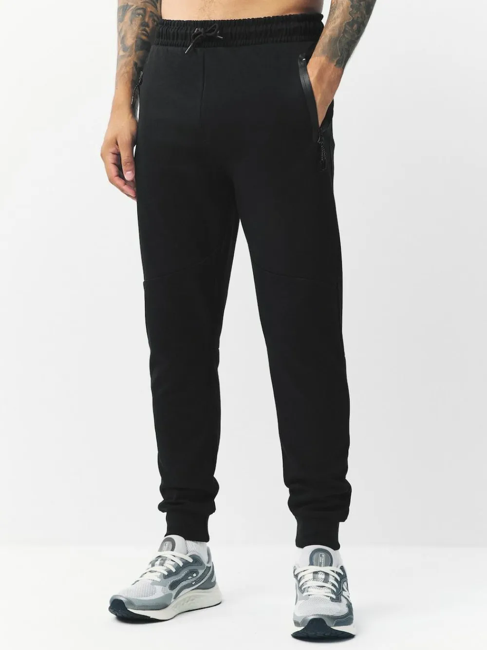 Relax in style and comfort with these athleisure black cuffed joggers. The soft-handle jersey fabric provides a comfortable feel for lounging or active days. Featuring stylish zip-fastening pockets and an adjustable drawcord waist, they are a perfect versatile addition to your casual wardrobe. Soft-handle jersey Zip-fastening pockets Cuffed joggers Machine washable. 63% Recycled polyester, 30% Cotton, 7% Elastane.