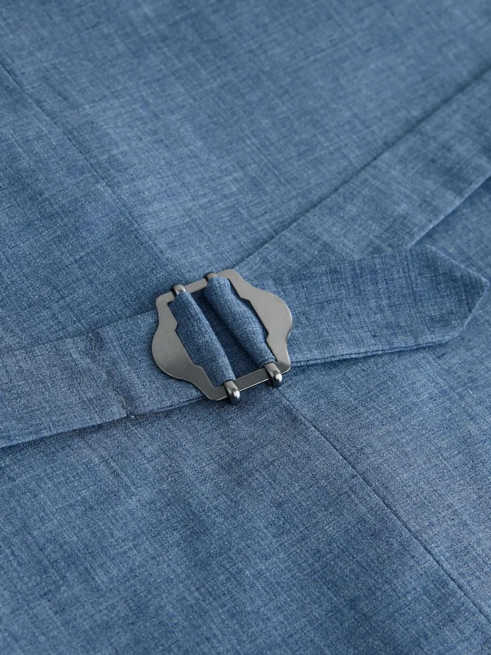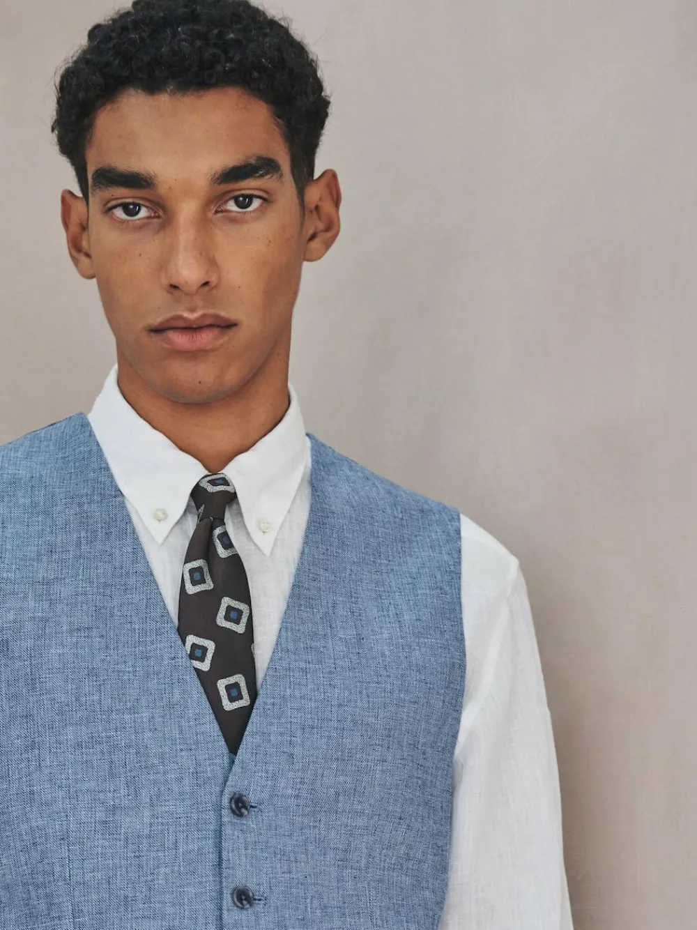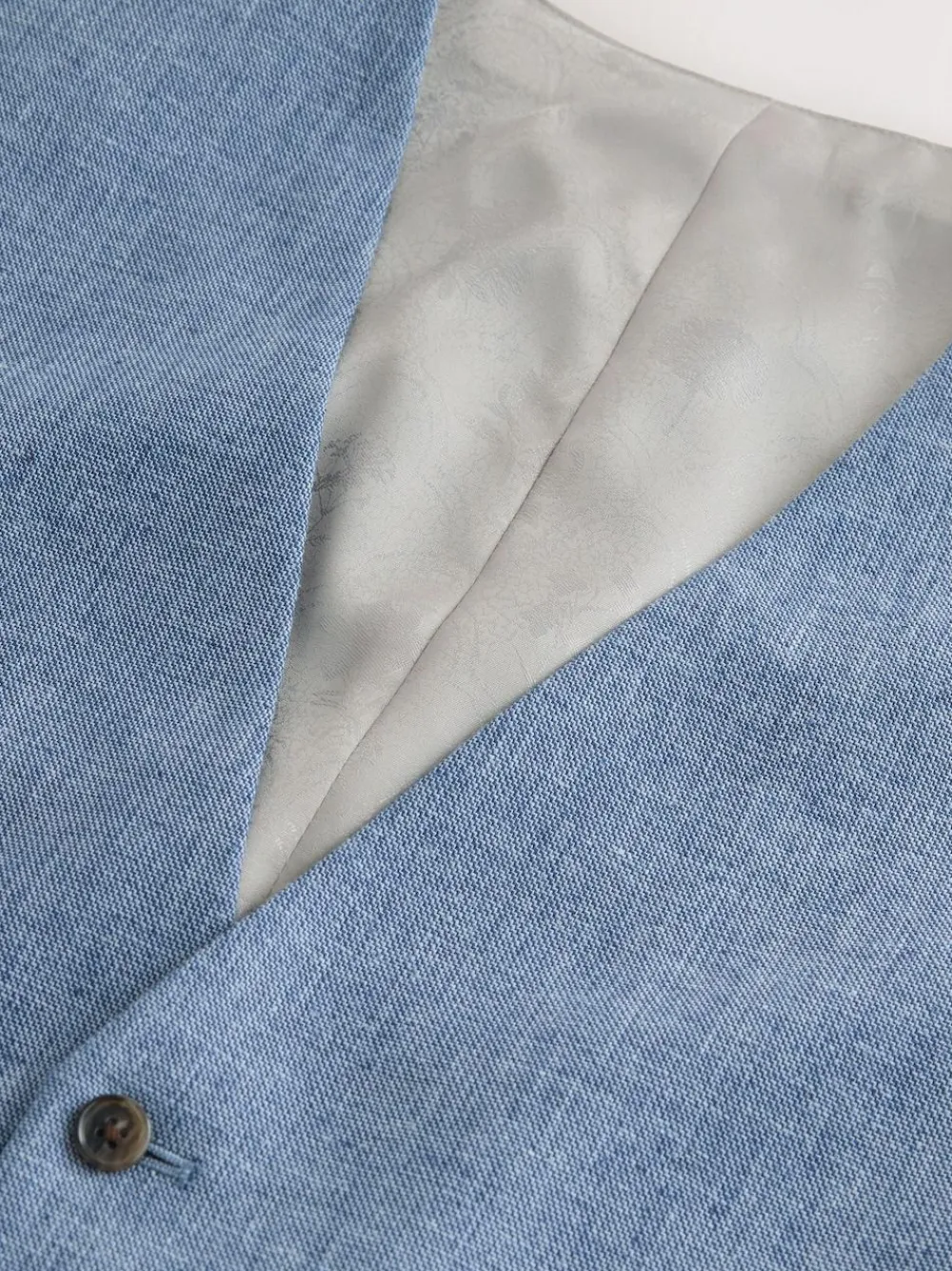 Complete your sharp, refined attire with this blue Linen Blend Texture Suit Waistcoat. Designed for formal or special occasions, its textured finish and classic button front offer a sophisticated, breathable layer perfect for warm-weather dressing. Blue Linen blend Textured fabric Button fastening Sleeveless Main 55% Linen, 45% Cotton. Inner Lining 100% Recycled polyester. Outer Lining 65% Polyester, 35% Cotton.