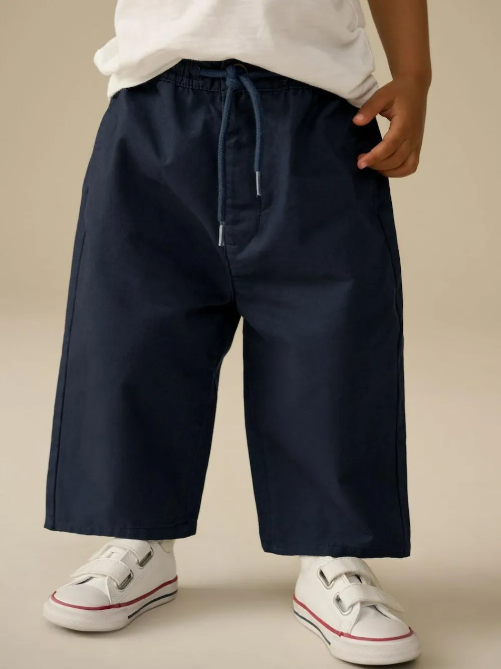 Your little dude will look super stylish in these navy blue wide leg chino trousers, made from pure cotton with a drawstring elasticated waistband, side pockets and a cropped ankle. Wide leg 100% cotton Adjustable elasticated waistband Side pockets Cropped ankle 100% Cotton.