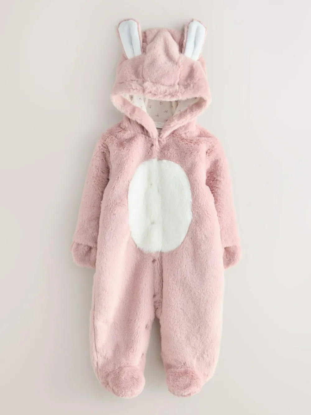 Let your little one hop into comfort with our pink faux fur bunny pramsuit. In a soft faux fur fabric, this hooded pramsuit is footed and comes with a attached mittens, fun ear detailing and zip front fastening. Faux fur Bunny shape design Zip front fastening Hooded Main 100% Recycled polyester. Sleeve Lining 100% Recycled polyester. Body Lining 100% Cotton. Warning: Keep away from fire and flames.