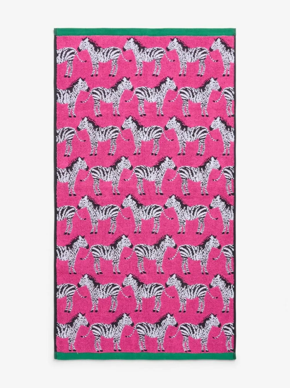 This bright and bold towel has an all-over Zebra print design set against a bold pink base with a green border trim, made from pure cotton. 100% cotton Zebra print Pink hue Green border Hand Towel Length 90cm / Width 50cm Bath Towel Length 127cm / Width 70cm Bath Sheet Length 150cm / Width 100cm Machine washable. 100% Cotton.