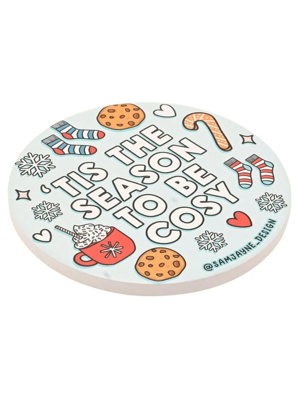 Tis The Season To Be Cosy Gift Set. The perfect excuse to sit back and enjoy your favourite hot drink with your feet up. Sam Jayne Design is an independent designer based in the North West of England. Sam has her own fun creative design studio where her products are designed to make you smile.Ideal for gifting, collecting, or simply treating yourself — because who doesn’t love the Christmas season.Wrap around print Mug with matching coaster.Mugs hand wash onlyCoasters Wipe clean only. Hand wash only. 100% Ceramic.
