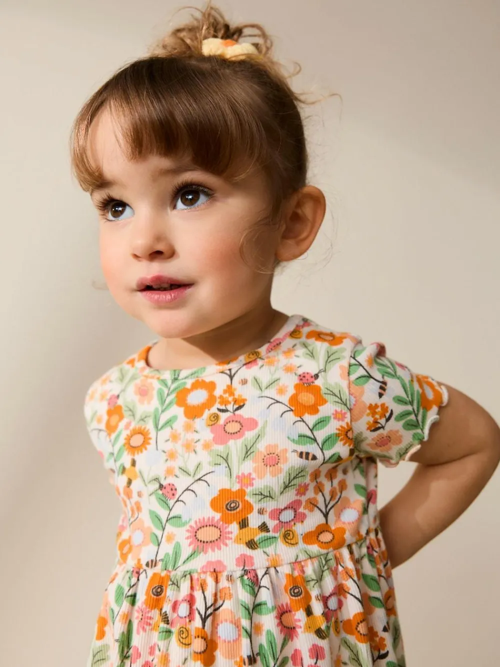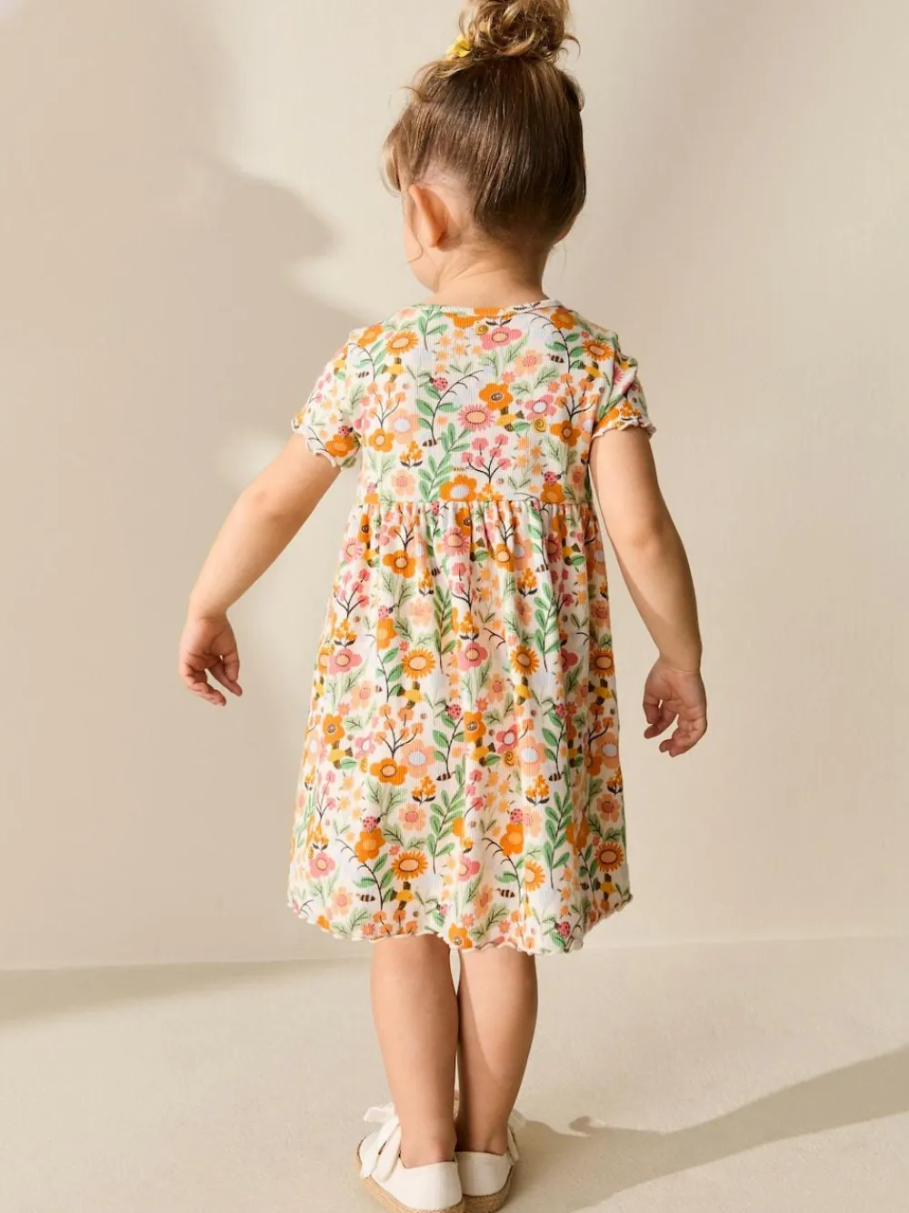 Dress her in charming autumn style with this adorable floral short sleeve ribbed dress, perfect for comfortable casual wear and family outings. Crafted from ribbed fabric, this dress features a tiered waist detail and a delightful fresh autumnal floral all over print for a sweet, everyday look. Short Sleeve Ribbed Dress Constructed from ribbed fabric Features a tiered waist Fresh autumnal floral all over print Comfortable casual design Machine washable. 95% Cotton, 5% Elastane.