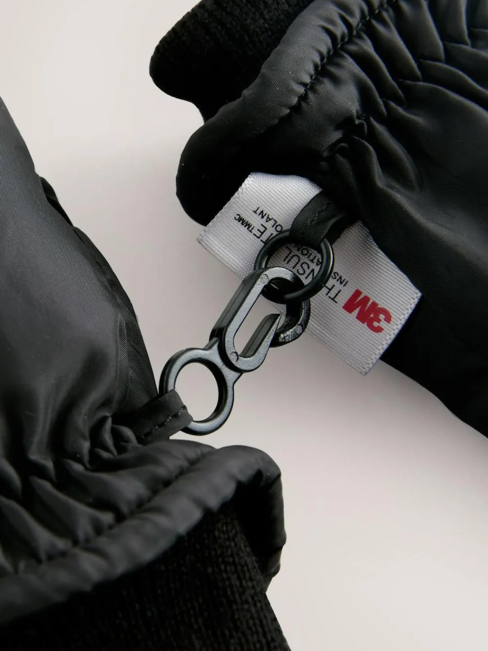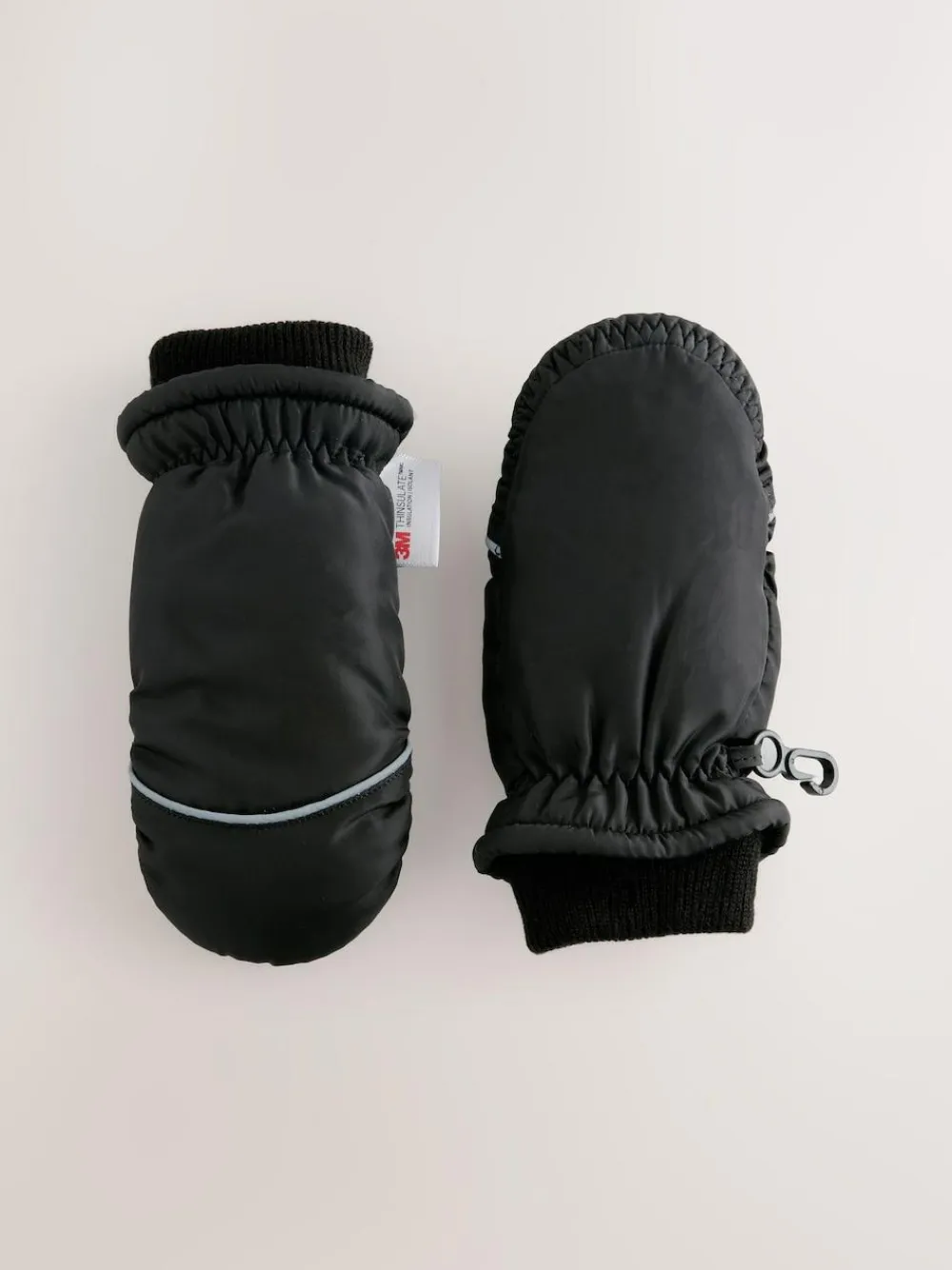 Keep little hands warm and dry on the slopes with these black ski mittens. They feature Thinsulate insulation for excellent warmth without bulk. The practical design is secured with a wrist fastener, ensuring a comfortable fit that is perfect for snowy adventures. Thinsulate insulation Wrist fastening Mittens style 3-9m + 1-2y: No thumbs 3-4y + 5-6y: With thumbs Machine washable. Shell 100% Recycled polyester. Lining 100% Recycled polyester. Wadding 65% Thinsulate® Polypropylene, 35% Thinsulate® Polyester. Cuffs 100% Acrylic.