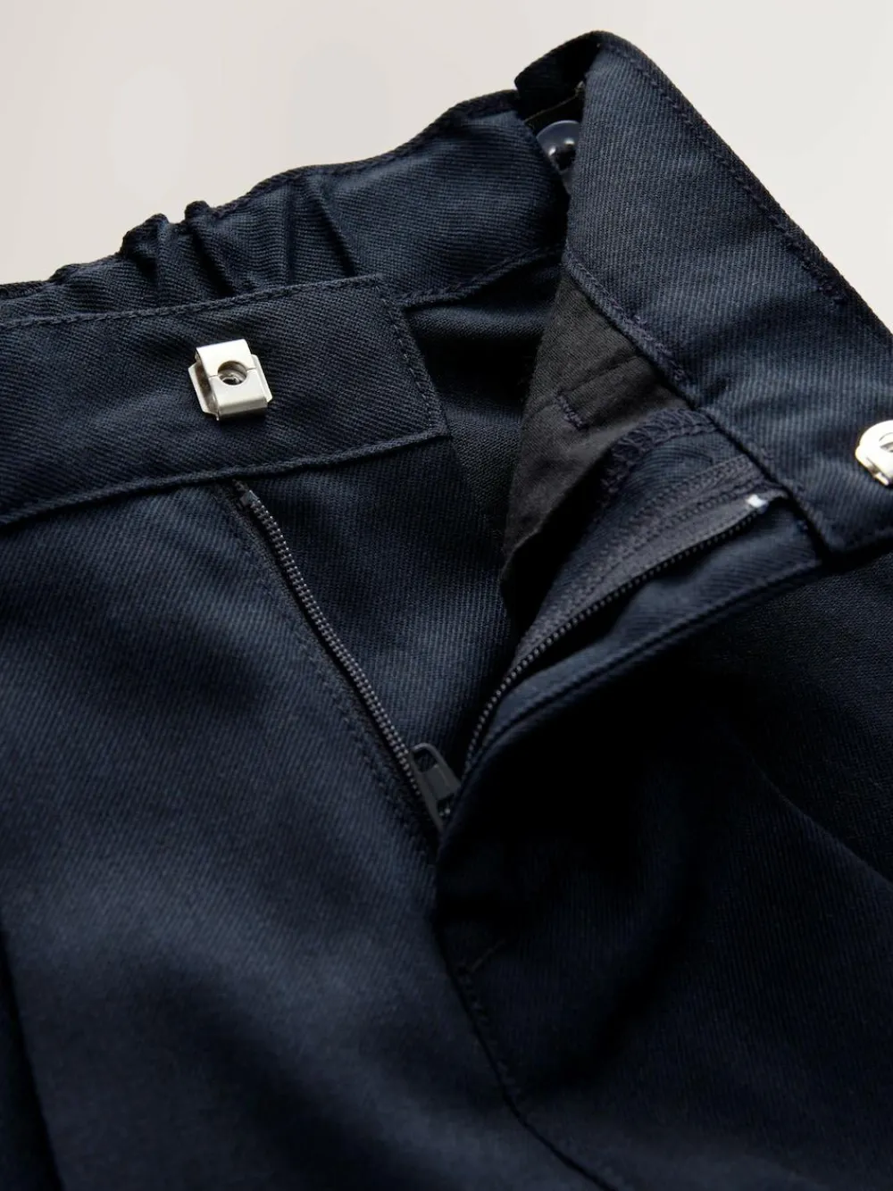 Our pleated navy, slim waist trousers are designed with an adjustable waistband for the perfect fit and a smart permanent centre-leg crease. With a hook and bar fastening and a stain repellent finish. Key features Easy Iron Fabric – Handy easy-iron finish Teflon® Technology – a treatment that repels water and water-based stains for easy cleaning and quick drying Machine washable Adjustable waist Permanent centre-leg crease Slim fit: -2 inches for a narrower fit on the waist Machine washable. 65% Recycled polyester, 35% LENZING™ ECOVERO™ Viscose. This product is made with teflon. Teflon® is a registered trademark of DuPont.