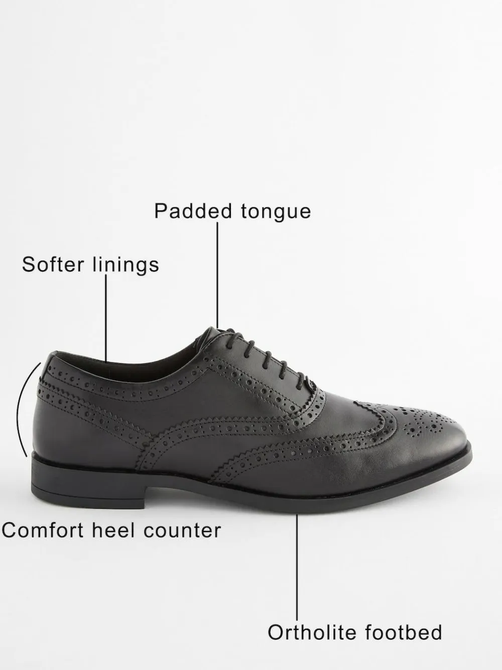Perfect for the office and special events, our Oxford brogues will be a classic addition to your formal wardrobe. Crafted with a soft leather upper and featuring a lace-up design, these traditional Oxford-style shoes are finished with an Ortholite foam sole for added comfort. Soft leather Lace-up design Oxford style Ortholite foam Wide Fit for extra comfort Upper – Leather, Lining & Sock – Textile, Other Materials, Sole – Other Materials.