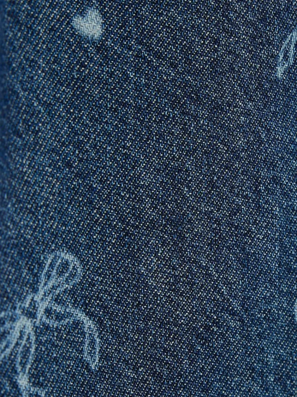 Set of 2Denim fabricJeansStraight legBow graphic print3D TrimmedLaser cutBelt loopsFront and back slip pockets Zip and button fasteningScrunchie Washable. 100% Cotton.