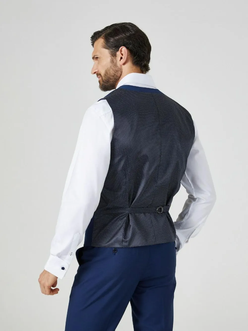 The Kennedy blue suit is perfect for the office, wedding or any formal occasion! The single-breasted suit waistcoat features include 5 button fastening, lower waist jetted pockets, jetted ticket pockets, polka dot lining and an adjustable back strap. See a matching tailored jacket and trousers. Dry clean only. 80% Polyester, 20% Viscose.