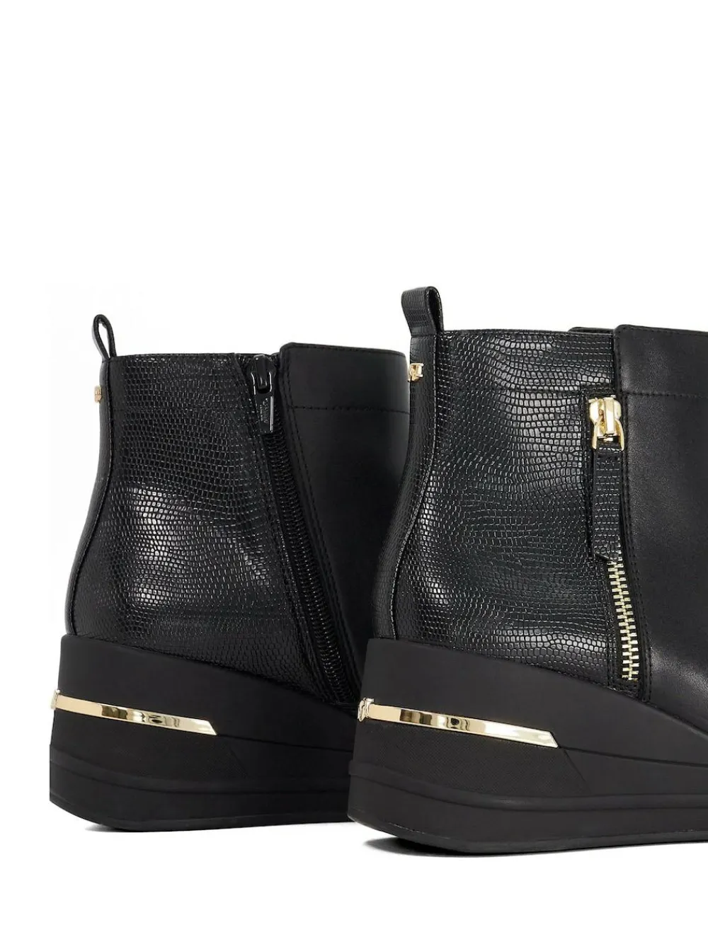 Step out in style and comfort with Everyone our black leather wedge ankle boots designed with everyday wear in mind. Featuring a sleek silhouette with a gold insert for a touch of luxe they re detailed with a side zip and rear pull tab for easy on-and-off. Lightweight and crafted for all-day comfort this versatile style is your go-to for effortless elevation. Main – Other Materials, Upper – Leather, Lining and Sock – Leather, Sole – Other Materials.