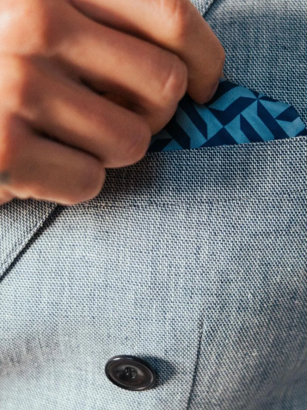 Designed for sun-drenched escapes and timeless “I do’s,” this lightweight blue cotton-linen suit jacket embodies effortless summer elegance. With its breathable fabric and impeccable tailoring, it’s the perfect choice for warm-weather sophistication, whether you re strolling along the coast or celebrating a special occasion in style. Double-Breast Peak Lapel Airo Finish Patch Pockets Pull-Out Pocket Hanky Contrast Pattern Lining Two Back Vents Model is 6 0′, wearing a 38R Jacket Dry clean only. 70% Cotton, 30% Linen.