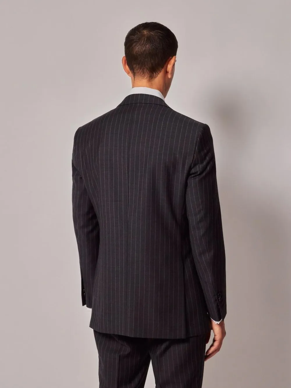 Elevate your suiting game with this charcoal chalk stripe jacket. Cut in a slim fit, the jacket is made from the finest super wool. The lined, single-breasted jacket is designed with a classic notch lapel and two front buttons. Choose this suit jacket for a refined look in the office or on special occasions. Finer details include a felt lining under the collar of the jacket and working button cuffs. Dry clean only. 100% Wool.