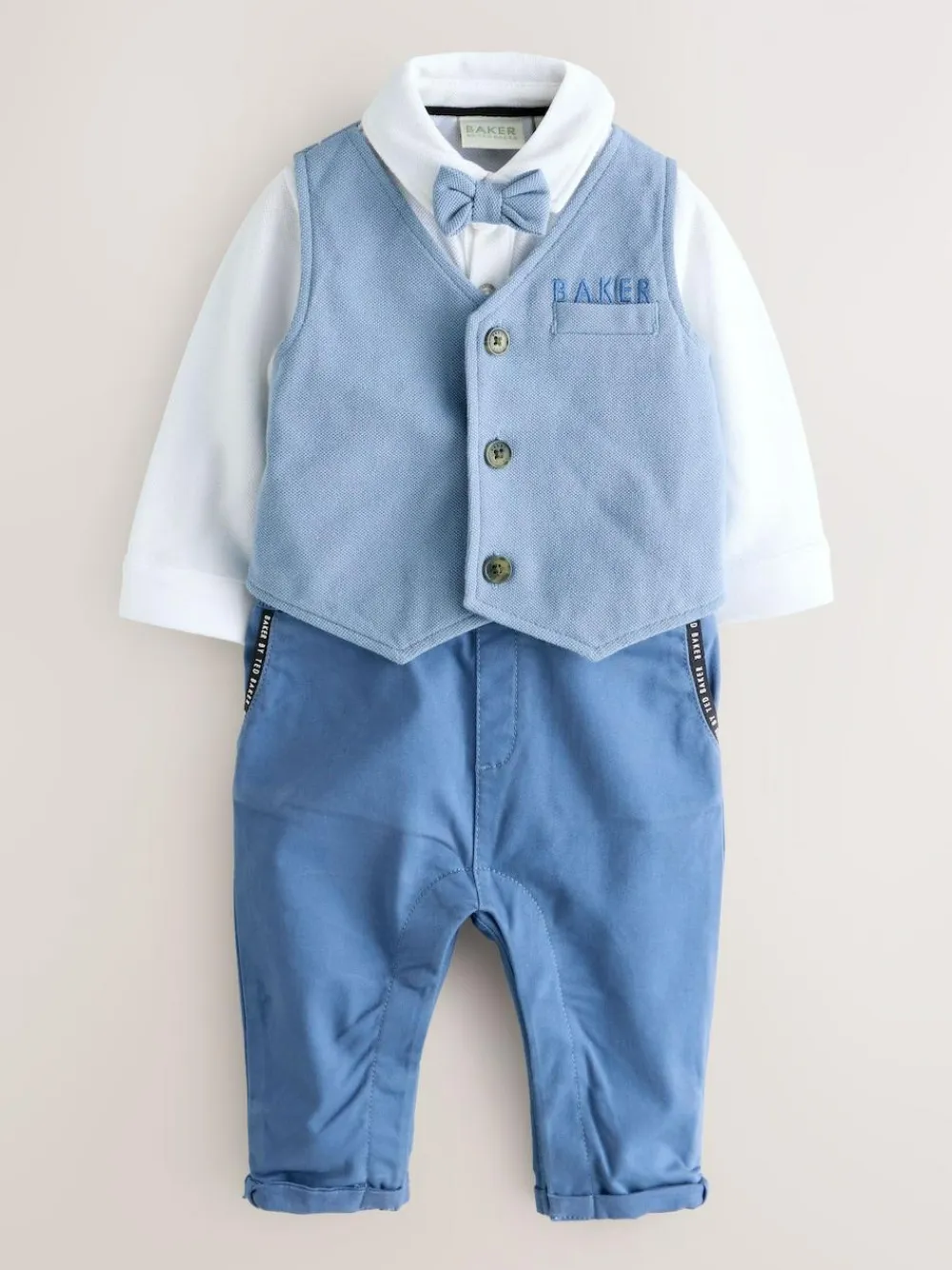 Romper Top 100% Cotton. Bottom 98% Cotton, 2% Elastane. Waistcoat Main 100% Cotton. Lining 100% Cotton. Bow Tie 100% Cotton.