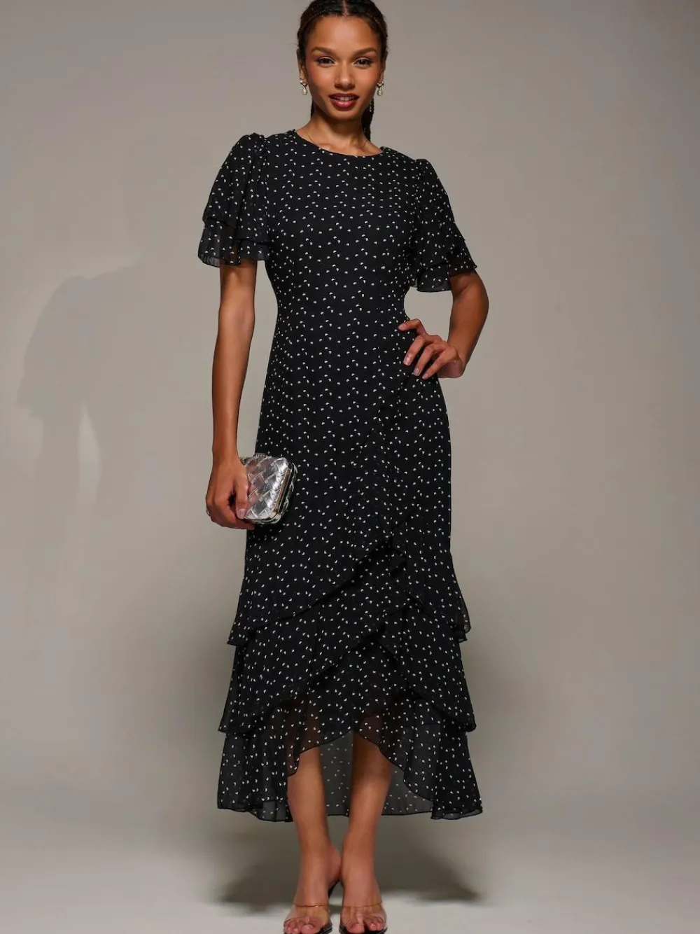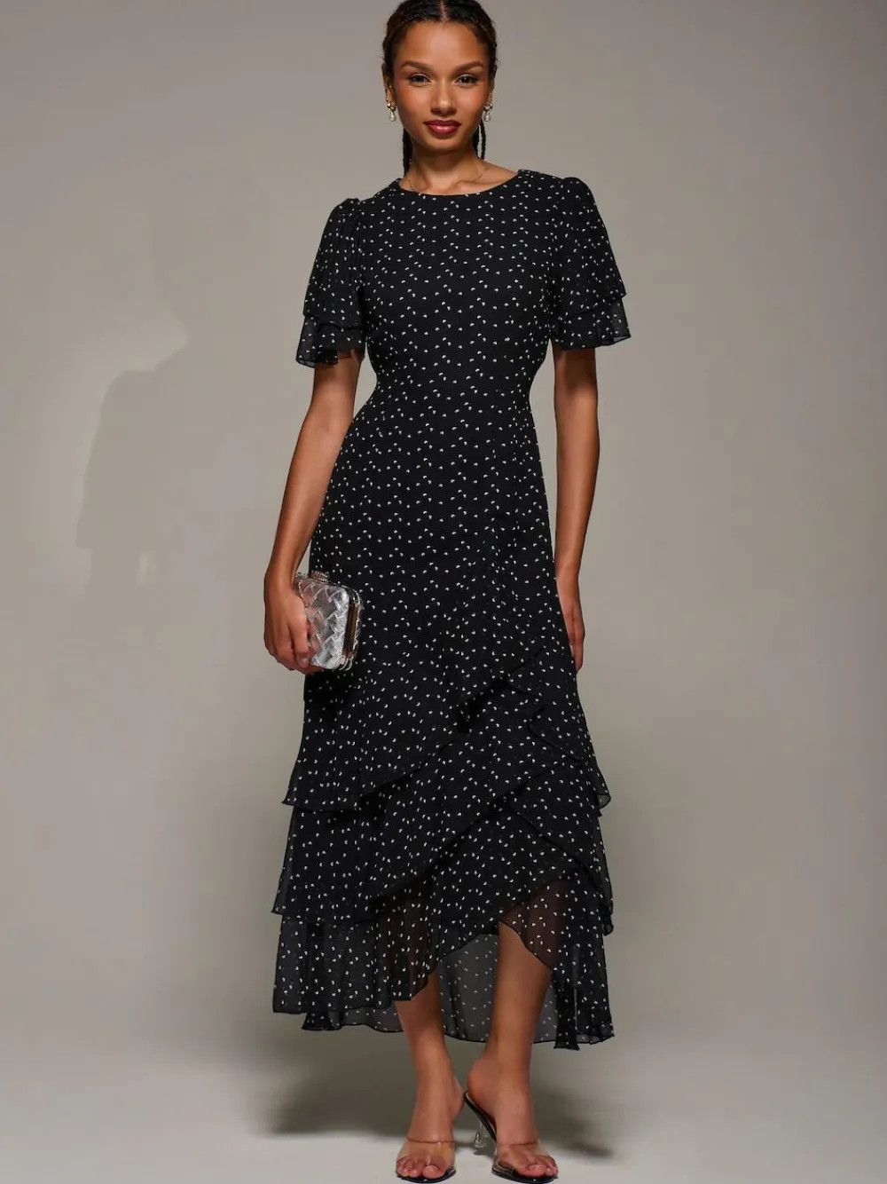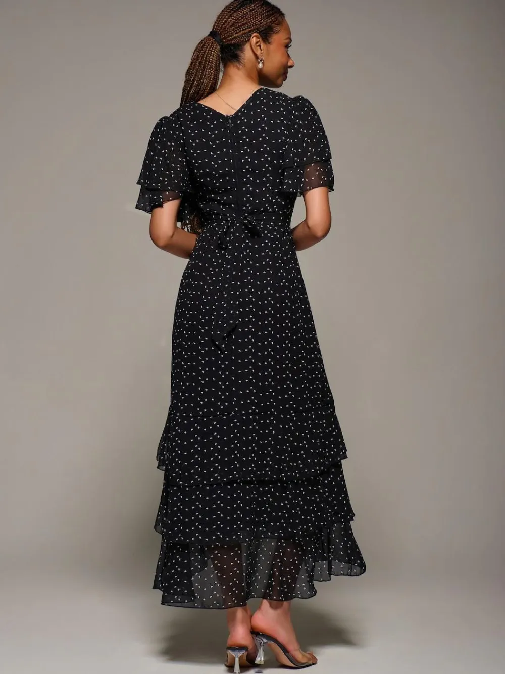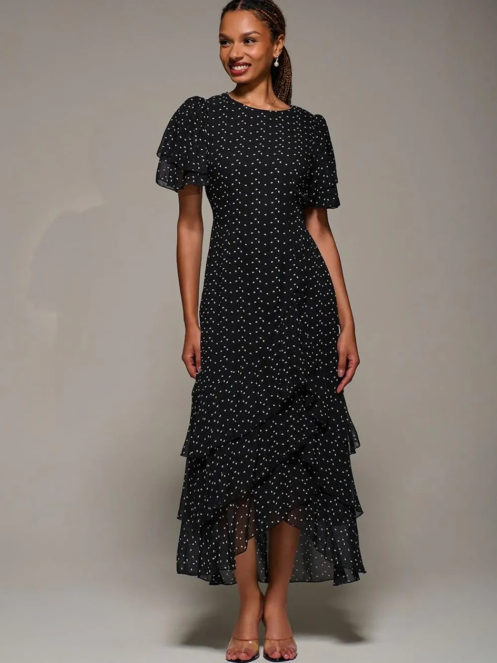 The Ruffle Detail Chiffon Midaxi Dress by Jolie Moi offers a round neckline and flared short sleeves. Made from lightweight chiffon, the dress has a flowing three-tier ruffle maxi skirt for added movement. Fully lined for comfort, the dress has a concealed zip and a tie waist at the back to create a flattering silhouette. Machine washable. 100% Polyester.