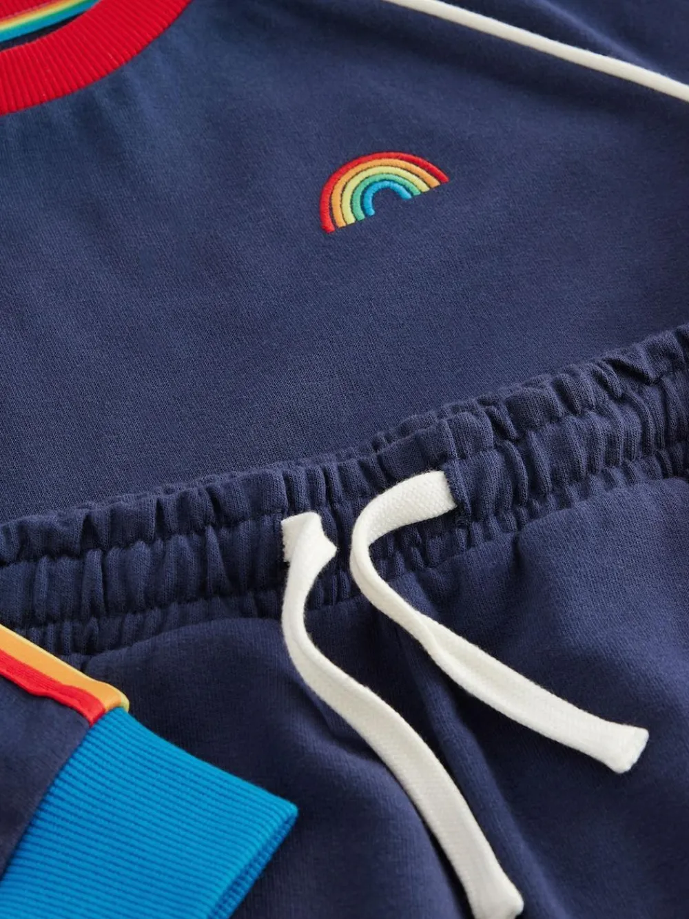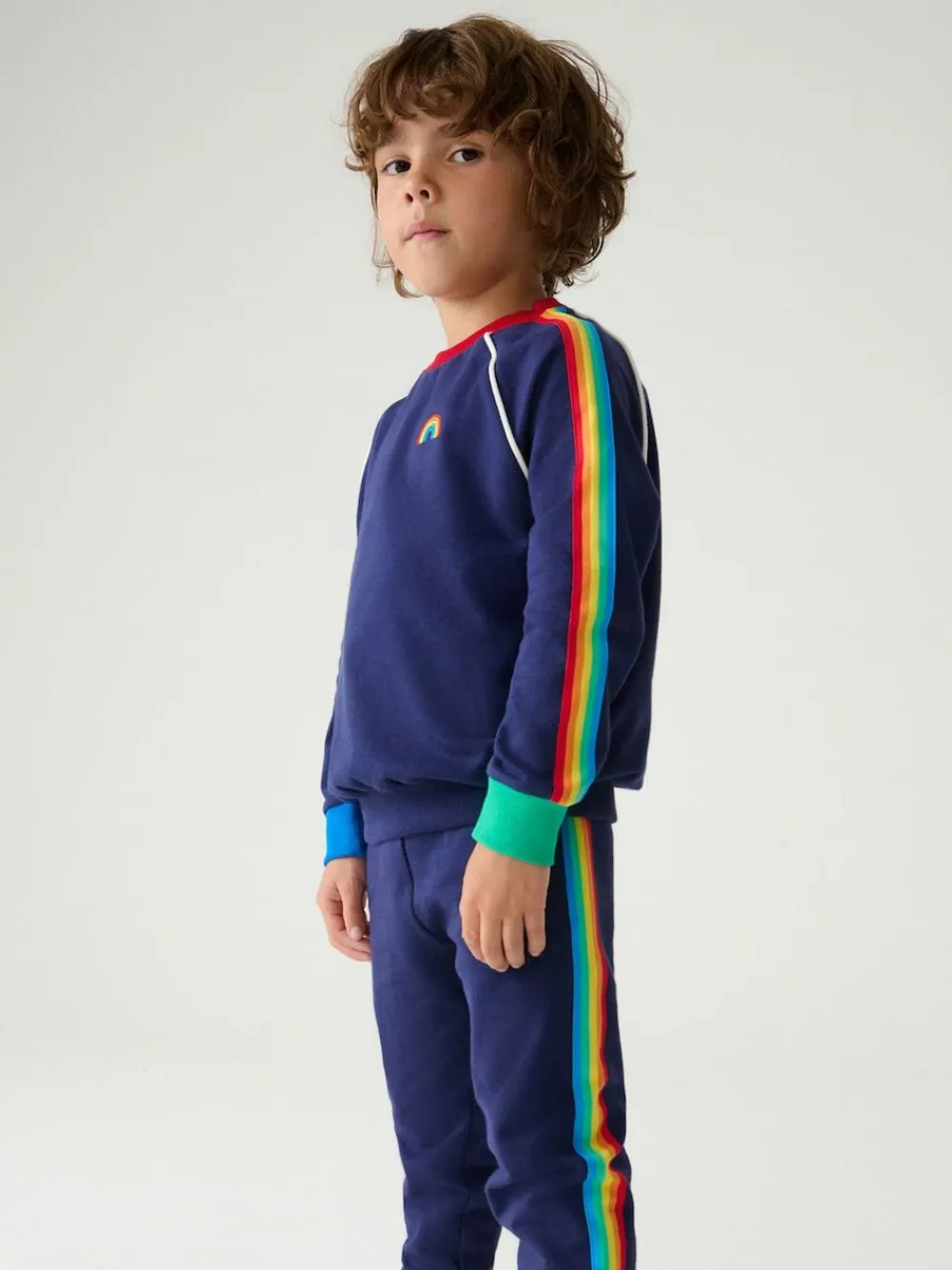 Your little one is going to love our jogger set from Little Bird by Jools Oliver. The two-piece outfit in navy is made from a soft and stretchy cotton and features a classic sweatshirt with a rainbow striped tape down the sleeves and rainbow embroidery on the chest. It comes with a matching pair of joggers that also have an elasticated waist for a comfortable fit. 2 piece outfit Rainbow striped tape detail Elasticated waistband Rainbow embroidery on chest Machine washable. Sweater and Jogger Body 100% Cotton. Rib 96% Cotton, 4% Elastane.