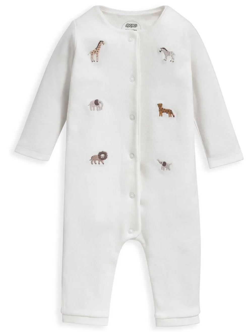 From newborn to 2 years old, Mamas & Papas have got those comfy essentials covered. Made from beautifully soft jersey cotton that will be kind to baby’s skin, their Basics collection is perfect for stocking up on wardrobe staples. And because they know just how many times you will be popping them in the washing machine, they’ve made sure these tough-wearing basics won’t let you down. Whether you’re cuddling up at home or getting all wrapped up for a walk, this all-in-one suit will keep baby cosy and warm. It’s got 6 cute safari characters embroidered onto the front of the soft jersey fabric, some of which can be found in our Welcome to the World soft toy range. Full Washing Instructions: 40 degree wash Do not bleach Cool tumble dry Warm iron Do not dry clean Wash with similar colours Wash inside out Iron on reverse Machine washable. 100% Cotton. Warning: Keep away from fire and flames.