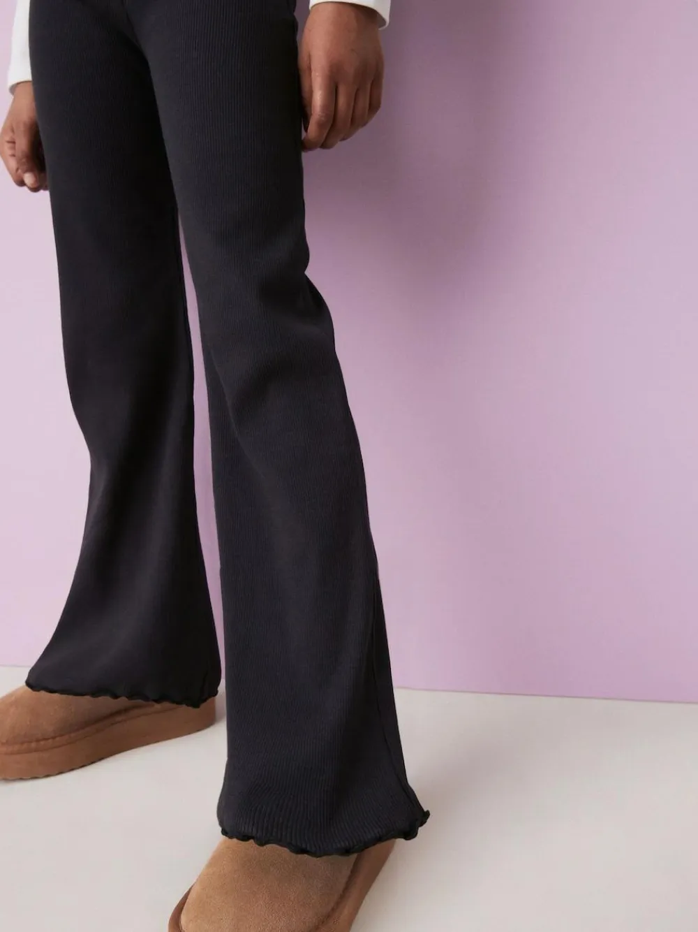 These black rib leggings have a stylish flare shape, made from a comfortable 4-way stretch cotton-rich fabric, finished with an elasticated waistband and a frilled trim. Ideal for everyday wear or school. Regular fit Flared leg 4-way stretch fabric Elasticated waistband Trim detailing Machine washable. 95% Cotton, 5% Elastane.
