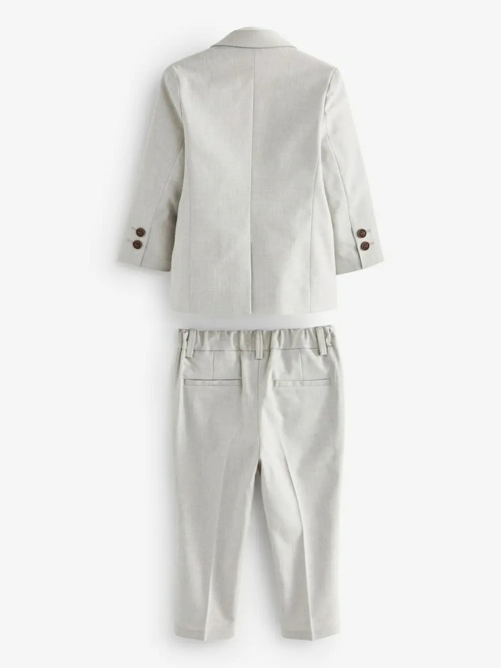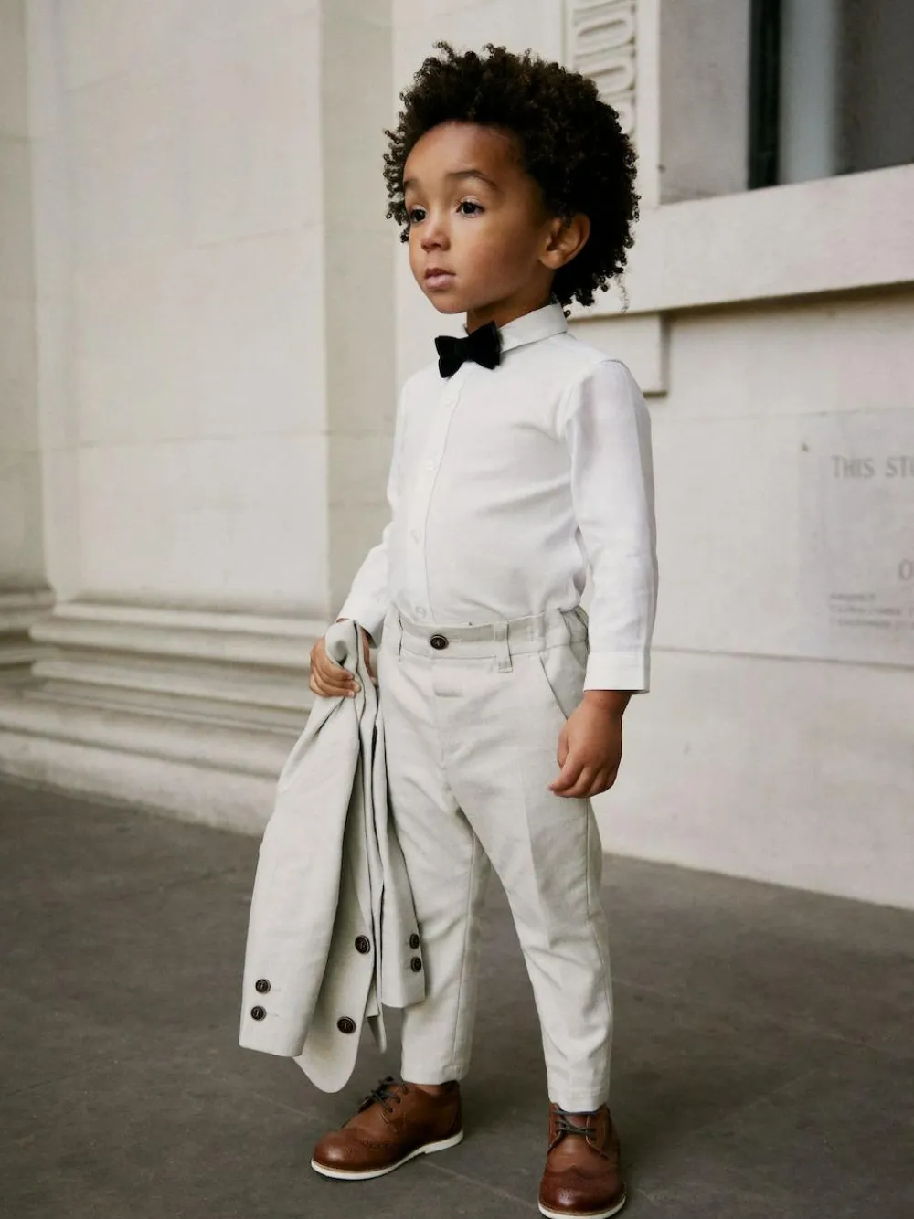 Your little one will look smart and stylish in this handy formal set, featuring a button-up shirt, a velvet bow tie, a single breasted blazer jacket with a lapel collar and coordinating center-crease trousers. Ideal for weddings, parties and special occasions. Regular fit 4-piece set Button up cotton shirt Velvet bow tie Single breasted blazer with lapel collar Smart trousers Jacket Blazer Main 54% Polyester, 23% Viscose, 15% Cotton, 6% Linen, 2% Elastane. Lining 100% Polyester. Shirt and Bow Tie 100% Cotton. Trouser 54% Polyester, 23% Viscose, 15% Cotton, 6% Linen, 2% Elastane.