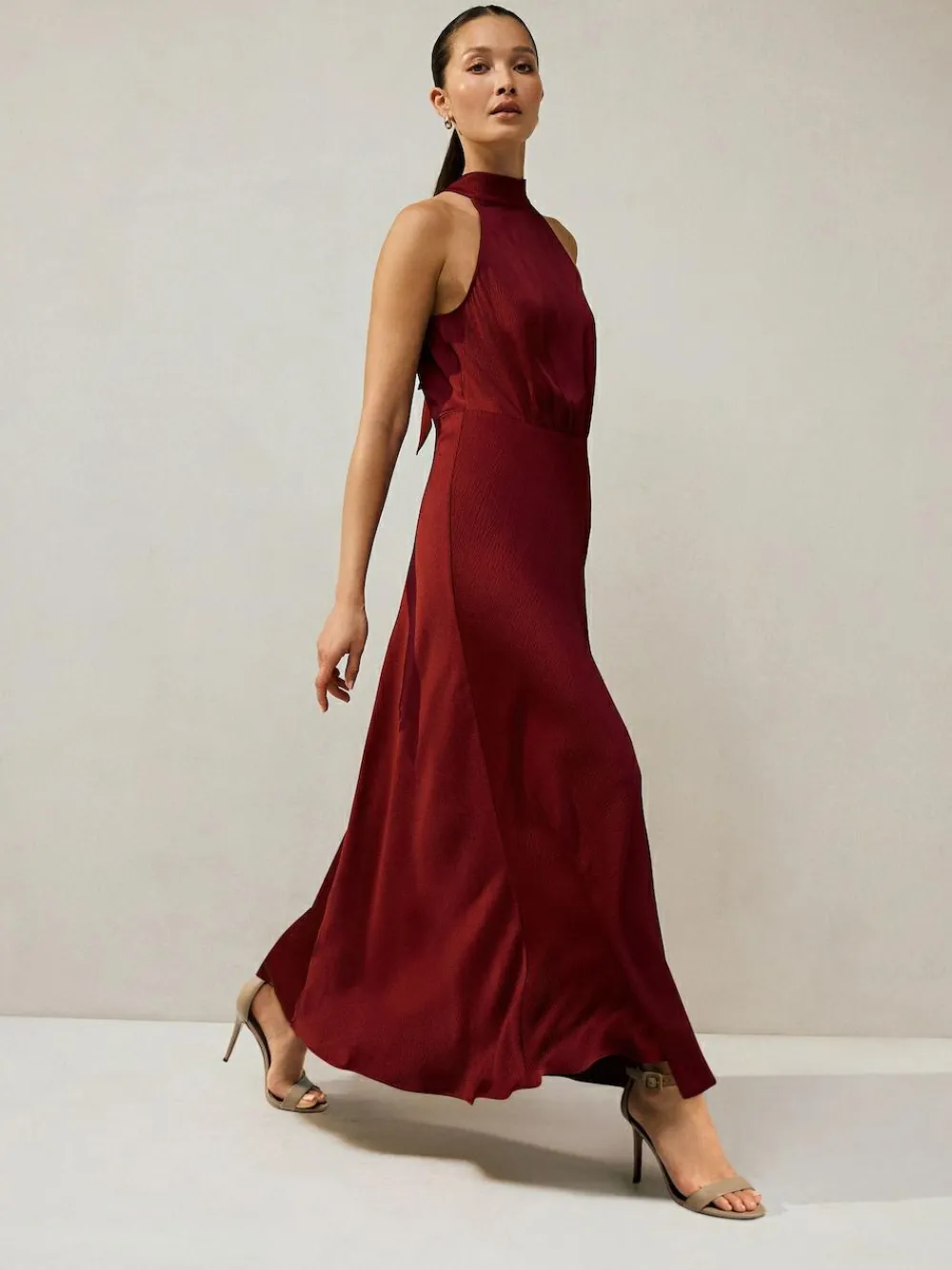 Our halter sleeveless maxi dress is the perfect occasion outfit that offers a textured satin fabric. In a flattering halterneck silhouette with an a-line skirt, this maxi number is ideal for summer weddings. Style with strappy heels to dress for the occasion Textured satin fabric Halterneck Maxi length A-line skirt Regular side neck to hem 50″ / 127cm. Machine washable. 51% Recycled polyester, 47% Polyester, 2% Elastane. Items with the curve logo are available in sizes 18 and above., Our tall collection is designed to fit women 5’10” and above. This has been proportionally increased through the body, leg and sleeve to achieve the perfect fit. Available in sizes 8-20.
