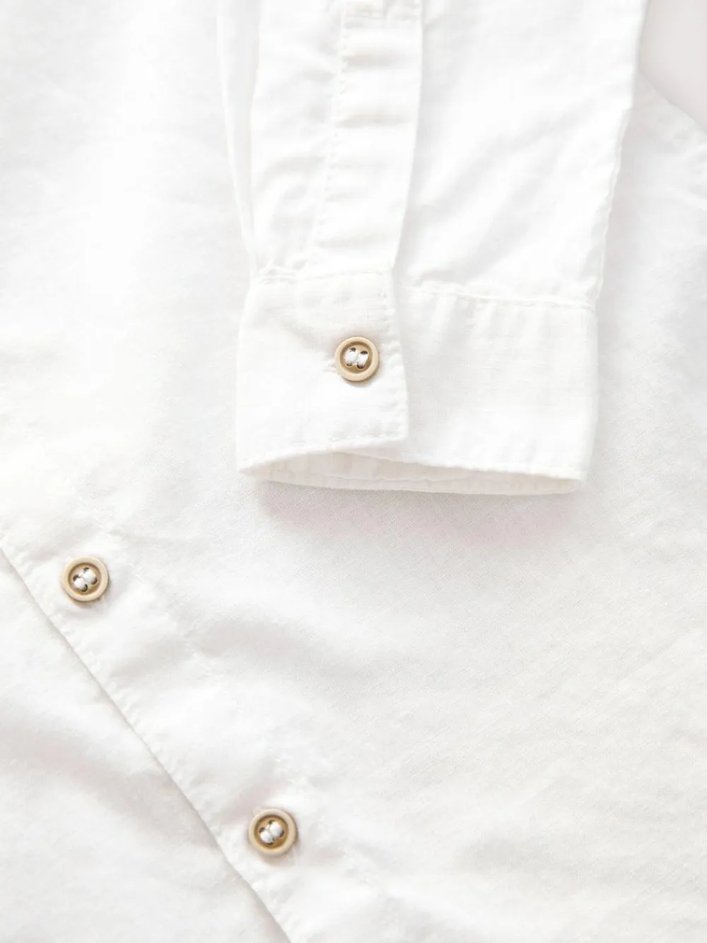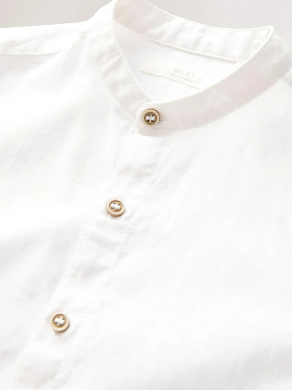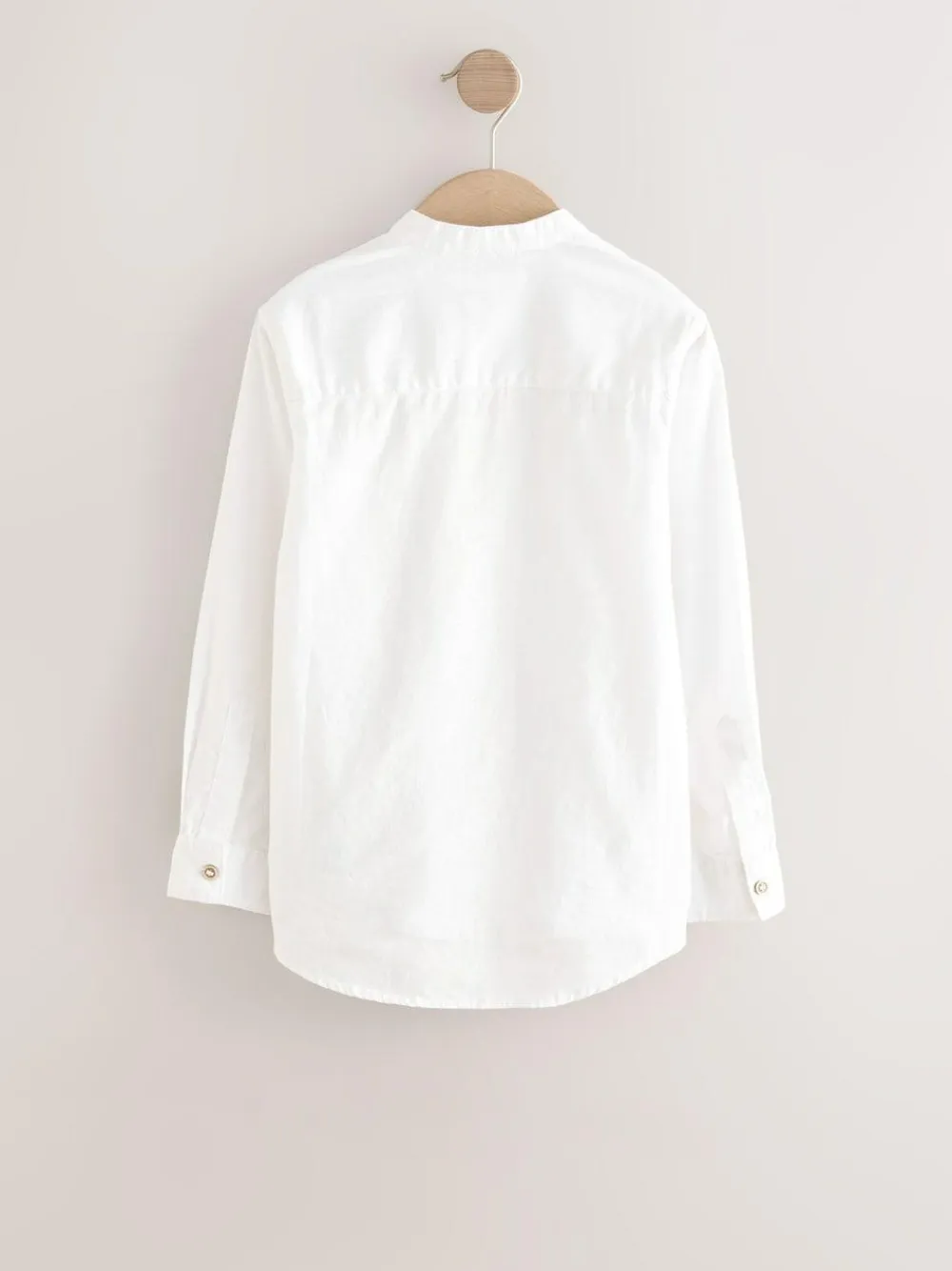 Our white linen blend shirt with a grandad collar is a smart choice for your little man’s summer wardrobe. Lightweight and breezy, it’s ideal for warm-weather events. Designed with classic button fastenings, it pairs effortlessly with smart trousers and shoes for a polished look. Lightweight linen blend Classic grandad collar Button fastenings Machine washable. 55% Linen, 45% Cotton.