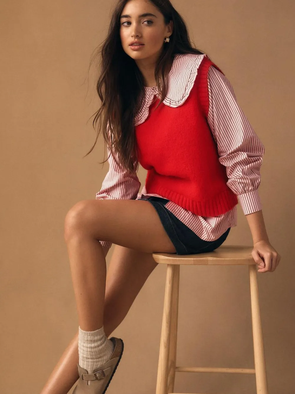 Infuse your daily ensemble with a touch of modern charm with this vibrant red knitted tank. Expertly crafted with a blend containing wool, this eye-catching piece features a layered pinstripe shirt underneath, complete with a statement frill collar and long sleeves. The layered design offers a polished and sophisticated look that transitions effortlessly from day to night, ensuring you stay both warm and stylish. Frill collar shirt layer knitted tank Long sleeve Contains wool Collar Machine washable. Knit 52% Recycled polyester, 37% Acrylic, 8% Wool, 3% Elastane. Woven 100% Cotton.