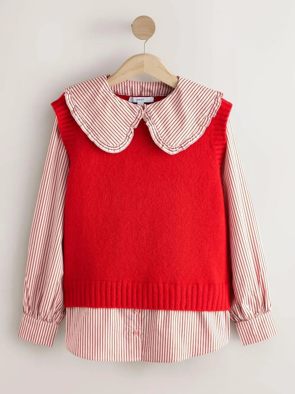 Hot Next Frill Collar Shirt Layer Knitted Tank Red Pinstripe