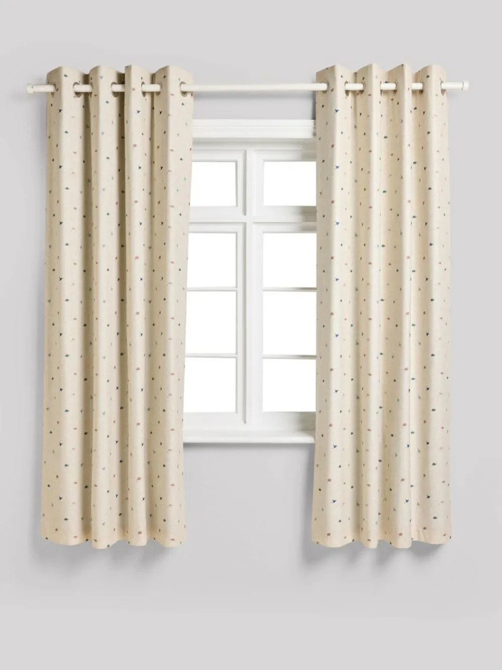 Draw these curtains and make it nighttime anytime. With their light blocking qualities, they prevent unwanted external light, making them great for kids bedrooms, lightsleepers or if you fancy a longer lie-in on a lazy weekend morning. Eyelet attachment Dinosaur print Blackout lining For top tips on measuring and finding the perfect pair of curtains for you, read our handy guide here Machine washable. 2 x Curtains Main 95% Recycled polyester, 5% Linen. Lining 100% Recycled polyester with acrylic backing. The sizes quoted are for each curtain panel.Suitable for curtain poles only – suggested sizes; Standard Width (117cm) – 120 to 165cmWide Width (168cm) – 165 to 250cm