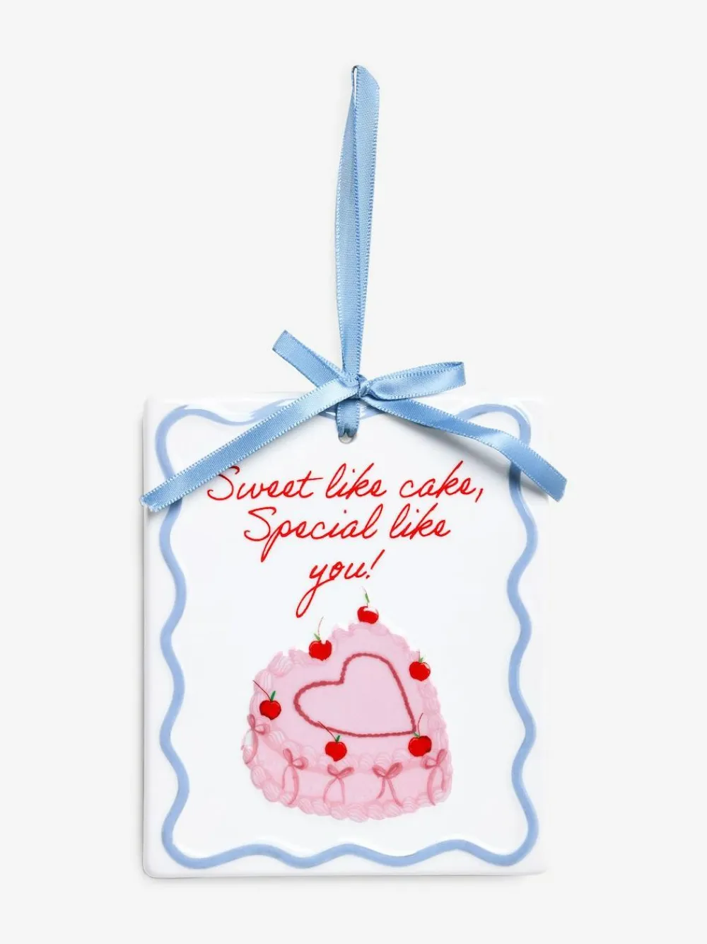 This pretty, and novelty ceramic hanging decoration featuring a cake illustration and equally sweet slogan. Perfect for hanging around your home, or as a gift for someone special. Height 21.5cm Width 1cm Depth 0.5cm 100% Ceramic.