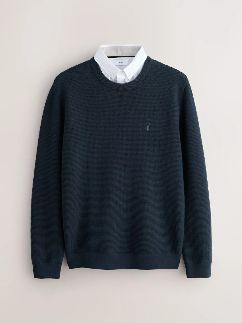 Perfect for a smart-casual look, this crew-neck textured jumper in navy blue is a versatile wardrobe staple. The comfortable, cotton-rich fabric provides all-day comfort, while the mock, white, Oxford shirt-collar detail offers the illusion of a layered look with minimal effort.Crew neck Cotton rich Oxford mock shirt detail Machine washable. Main 86% Cotton, 14% Nylon. Collar 100% Cotton.
