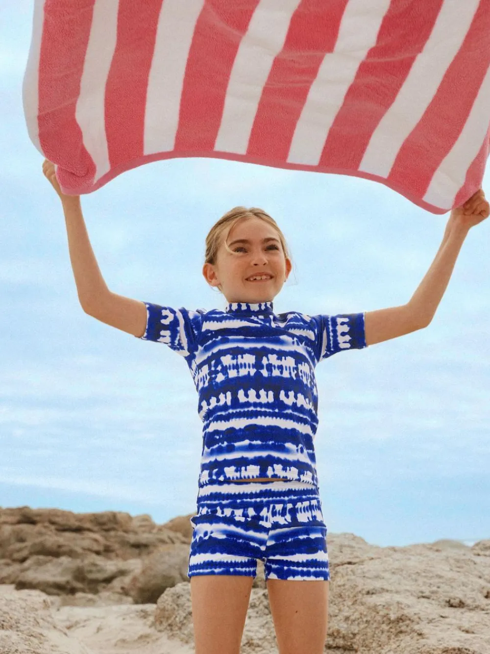 This bright Sunsafe Rash Vest And Shorts Swim Set is perfect for holiday fun in the sun. It features a long sleeve sunsafe rash vest and coordinating shorts, both made from soft stretchy fabric with a high UPF rating of 50+ for protection. Long sleeve sunsafe Perfect for holiday Soft stretchy fabric UPF rating of 50+ Rash vest and shorts set Machine washable. Sunsafe Top and Bikini Bottom Main 82% Recycled polyester, 18% Elastane. Lining 92% Recycled polyester, 8% Elastane. This fabric will provide protection against solar ultraviolet radiation. It has been independently tested and given a UPF rating of 50+ which blocks more than 97.5% of UV rays. Important Advice: • Sun exposure causes skin damage • Only covered areas are protected • Always use a high protection factor sunscreen on any exposed areas of skin • The protection offered by this fabric may be reduced with use or if stretched or wet • Always rinse in fresh water after each use • Young children should be kept in the shade between 11 and 3 • Don’t forget your hat and sunglasses. • Fabric provides UVA +UVB protection from the sun.