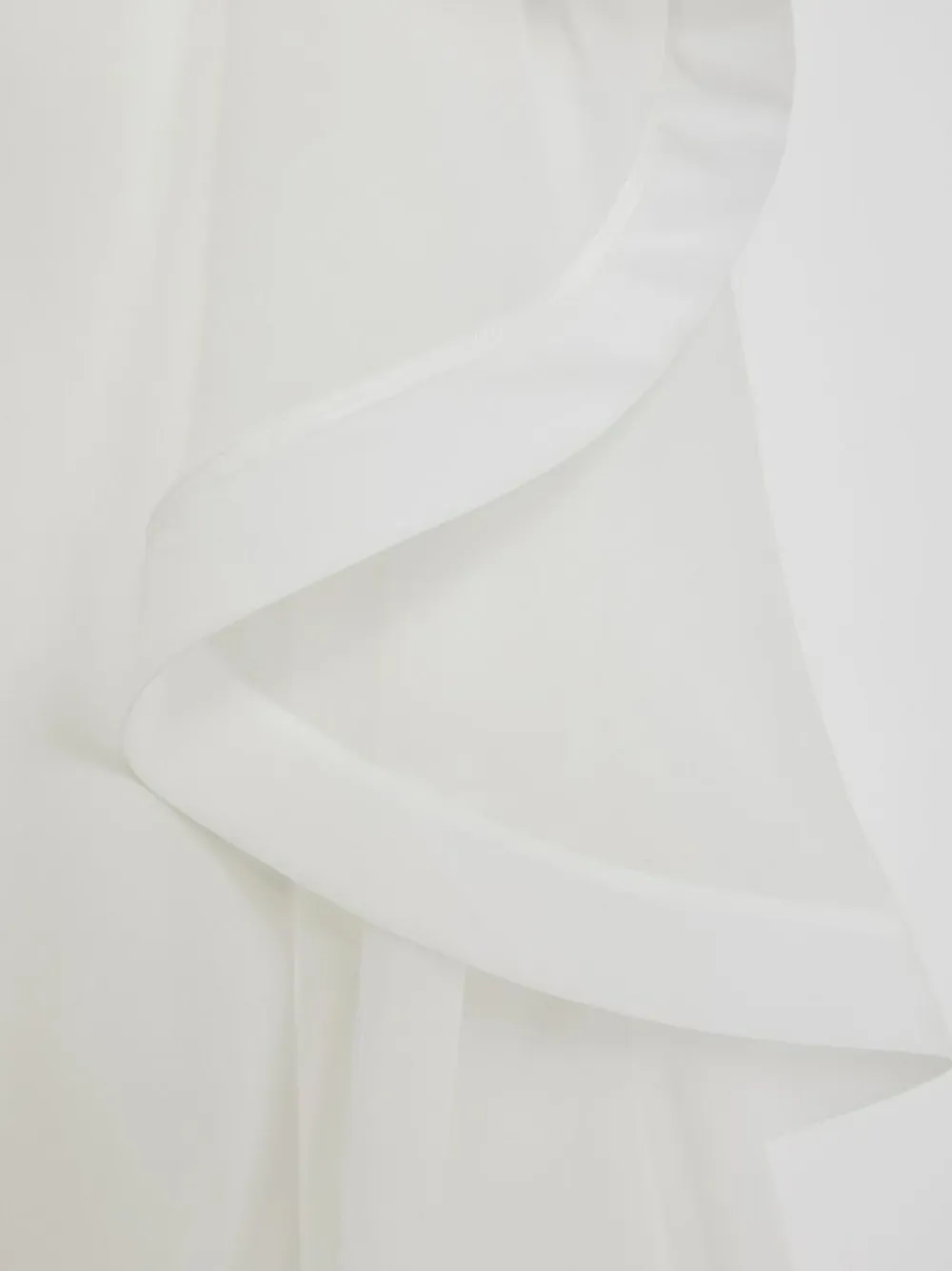 The Rhiannon jumpsuit is crafted from silk with a fitted bodice and a bandeau neckline. Flowing into wide legs for a clean, elegant silhouette. It’s overlaid with a sheer, asymmetric ruffle that cascades down one side, structured with a defined trim to add drama and movement. 100% silk Structured asymmetric ruffle Bandeau neckline Wide leg Front pintucks Concealed zip to reverse The model is wearing a size 8. Measurements of model: 5ft 9.5” / 177cm. Regular inside leg length 31.5″ / 80cm. Dry clean only. Main 100% Silk. Trim 78% Polyester, 18% Viscose, 4% Elastane.