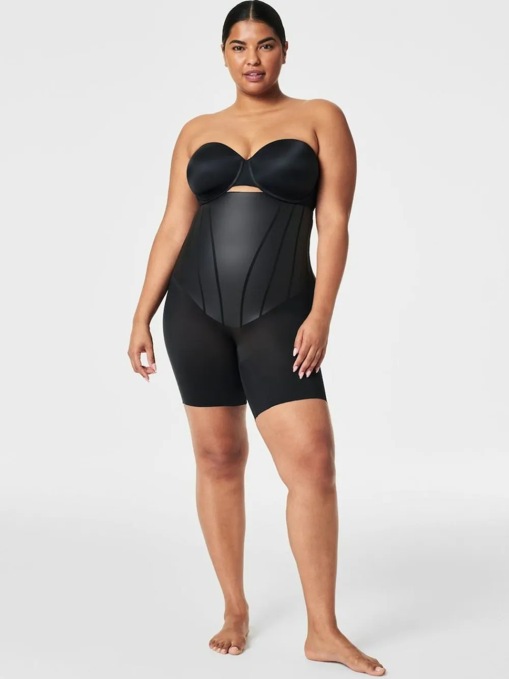 SPANXsupersculpt™ TotalContour High-Waisted Mid-Thigh Short is your new go-to for ultra-powerful sculpting that transforms your curves. Powered by flexible, built-in boning and LYCRA® FitSense Print™ Technology for added waist, core, and thigh support, this shapewear is engineered for 360-degree sculpting to deliver that cinched hourglass shape. Featuring a stay-put silicone waistband for a no-roll, no-shift fit and back seam shirring to define and lift your booty, this shapewear is breathable, quick-drying, and provides our strongest compression that will have you feeling oh-so-snatched. Body 66% Nylon, 34% Lycra® Elastane. Gusset 80% Nylon, 20% Elastane.