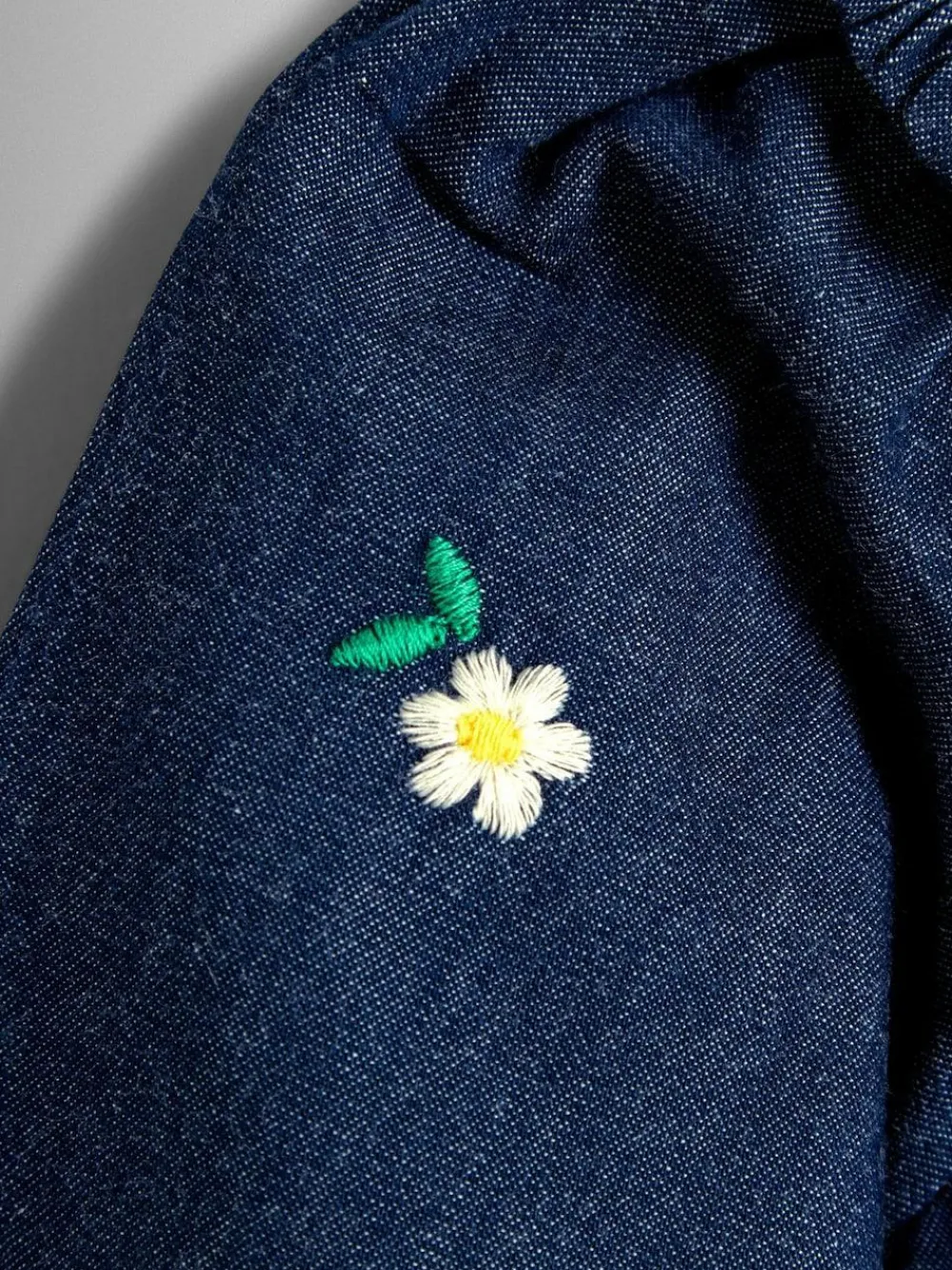 Dressing for flower-picking, picnicking days just got easier. From parties to playdates, this Embroidered Collared Dress boasts a delightfully delicately frilled Peter Pan collar for layering and looking smart as well as a floaty skirt to add volume for those twirl-worthy moments. This spring-ready style is a cottage-core look that will leave your little one feeling oh so comfy and cute!• Chambray blue dress• Button down front• Long sleeves• Floral embroidery• Peter Pan frilled collar• Machine washable 100% Cotton.