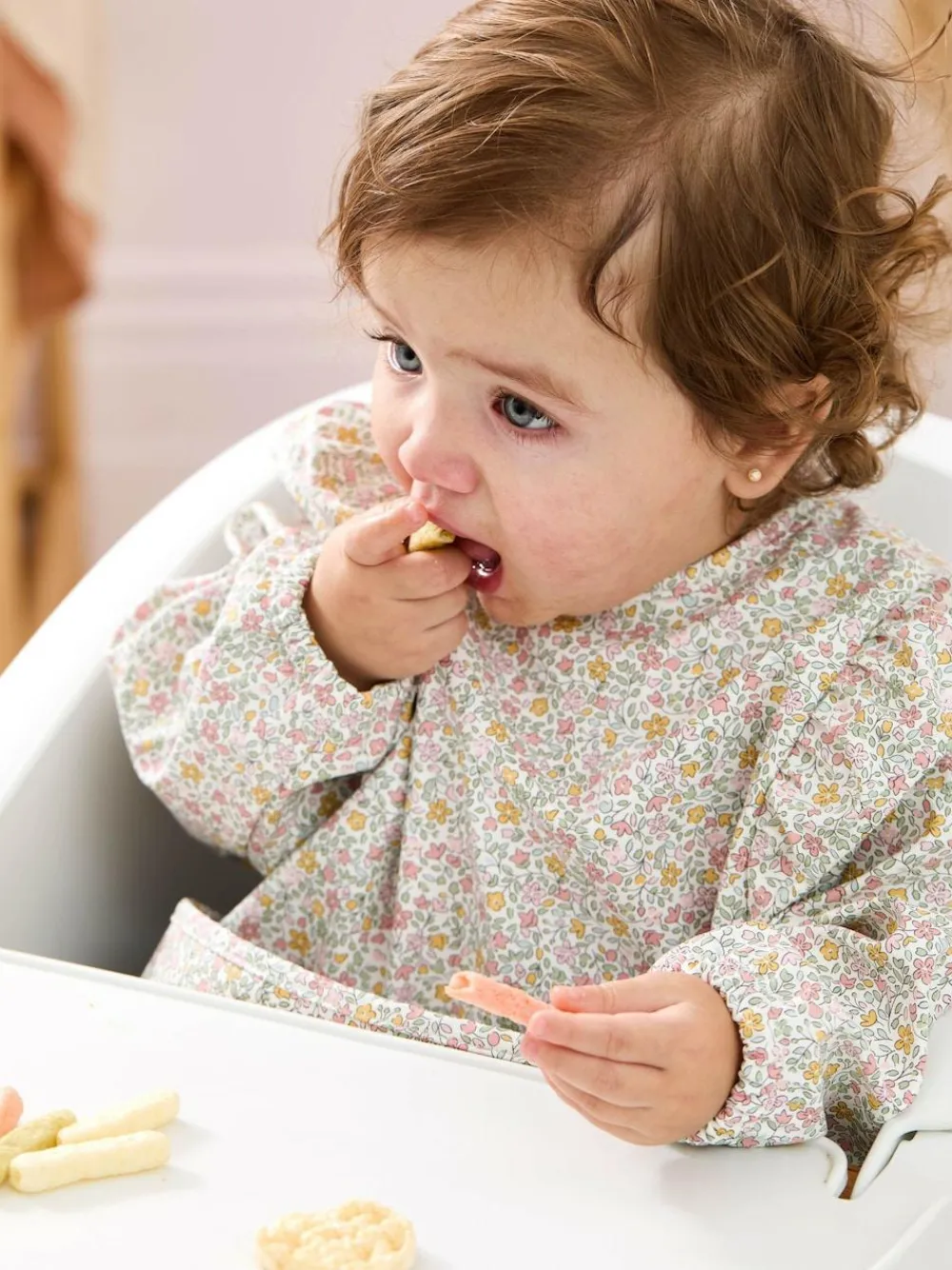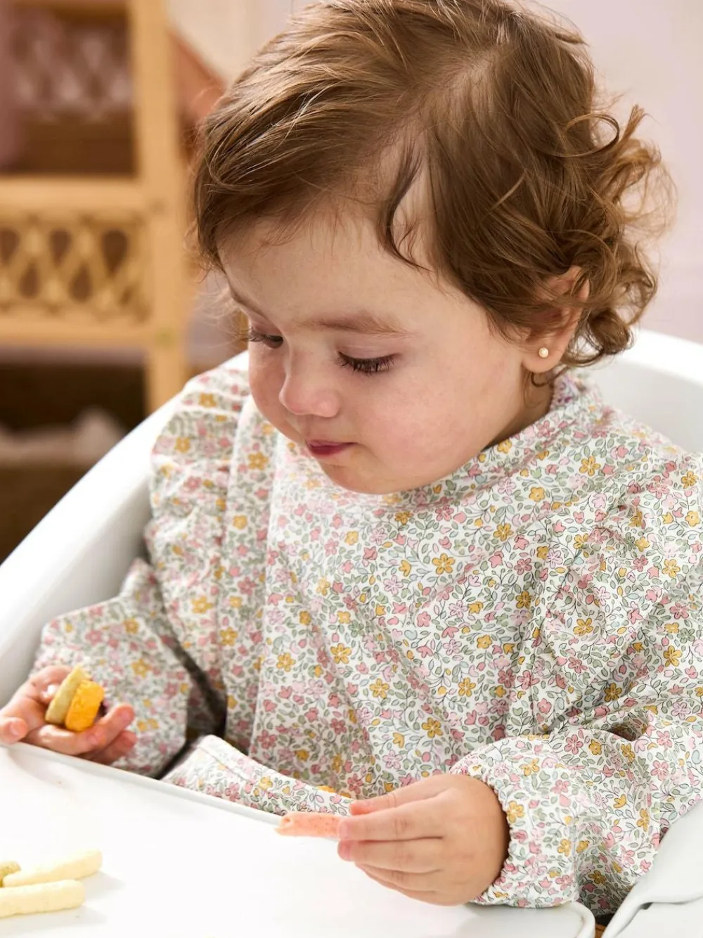 Be ready for messy spills while wearing pretty frills! This long-sleeved bib comes with extra coverage and an oh-so-handy pocket to catch crumbs. The Ditsy floral sleeved bib keeps messes and dribbles under control, and the frill shoulders add a lovely finish. Little munchkins will love messy mealtimes whilst their outfits stay dry and clean underneath. Perfect for lots of activities, so little mischief makers can play, paint, craft and bake the day away! Long-sleeved bib Floral ditsy print Frilled shoulders Made from a soft and splash-proof fabric Comfortable fit Catch-crumb pocket Ripstop fastening Machine washable 76% Recycled polyester, 24% Polyurethane.