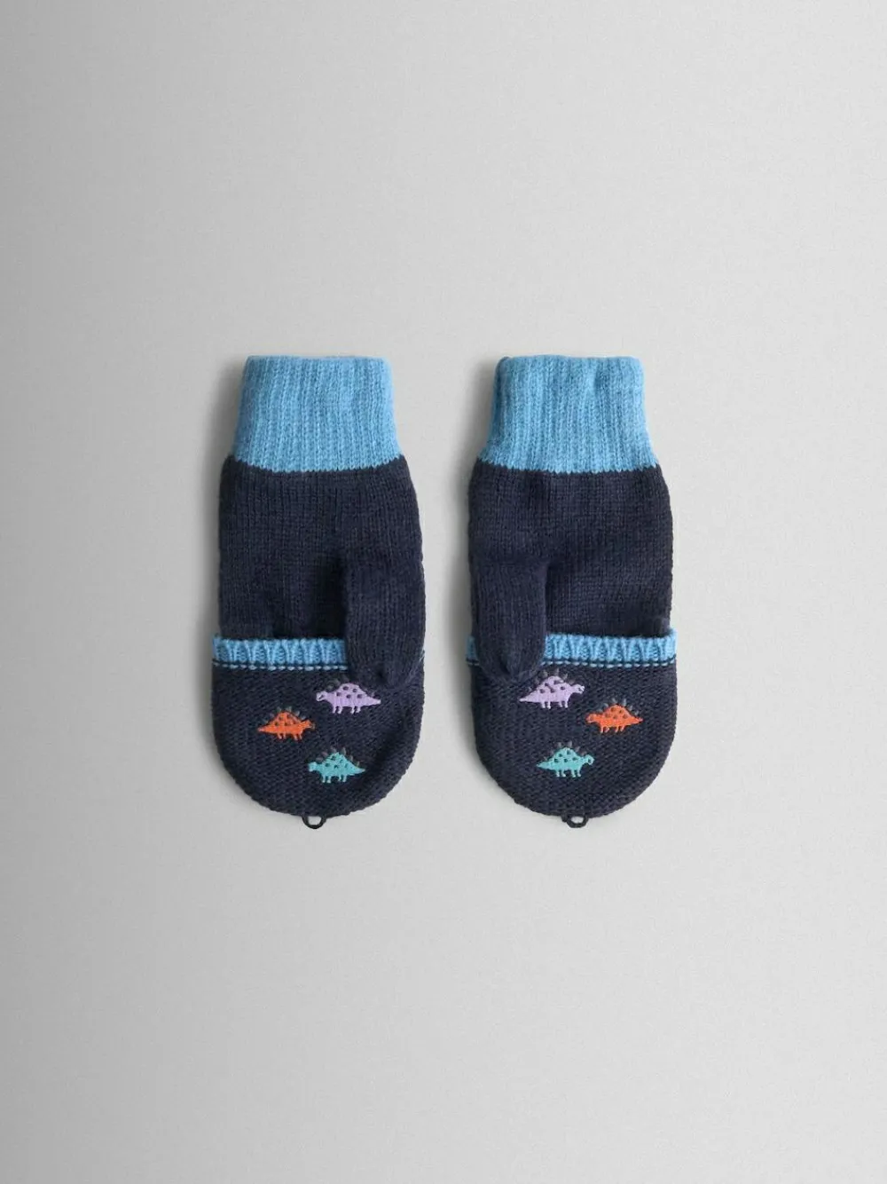Rawr-some adventures await! These Dino Gloves are perfect for little explorers who love a touch of prehistoric charm. With blue ribbed details, colourful all-over dinosaur embroidery and a fun convertible design, they keep tiny hands toasty while still ready for action. Wear them as mittens, or unbutton the top to reveal fingerless gloves — perfect for playtime or dino spotting! Rib cuffs ensure the mittens stay on, while the flexible fit means they’re comfy to wear. Soft wool blend Natural and blue colours with colourful dinosaur embroidery Ribbed cuffs for a secure fit Unrestrictive, flexible fit Wear as mittens or fingerless gloves Machine washable Matching items available 70% Acrylic, 30% Wool.