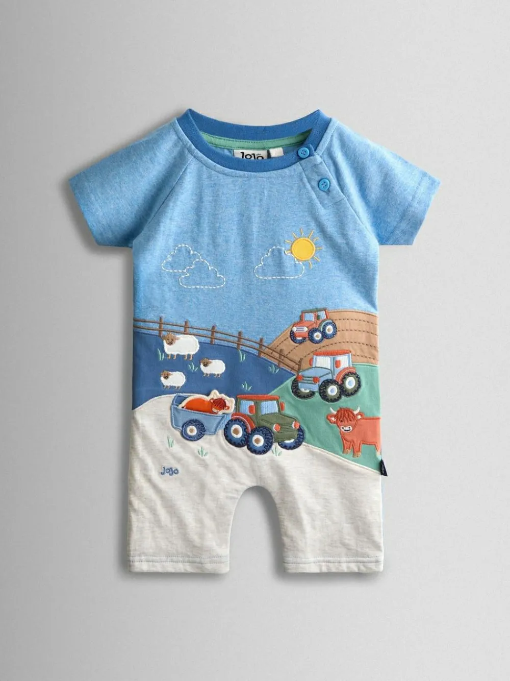 Jojo Maman Bébé Light Blue Tractor Appliqué Scene Romper^ Rompers & Overalls