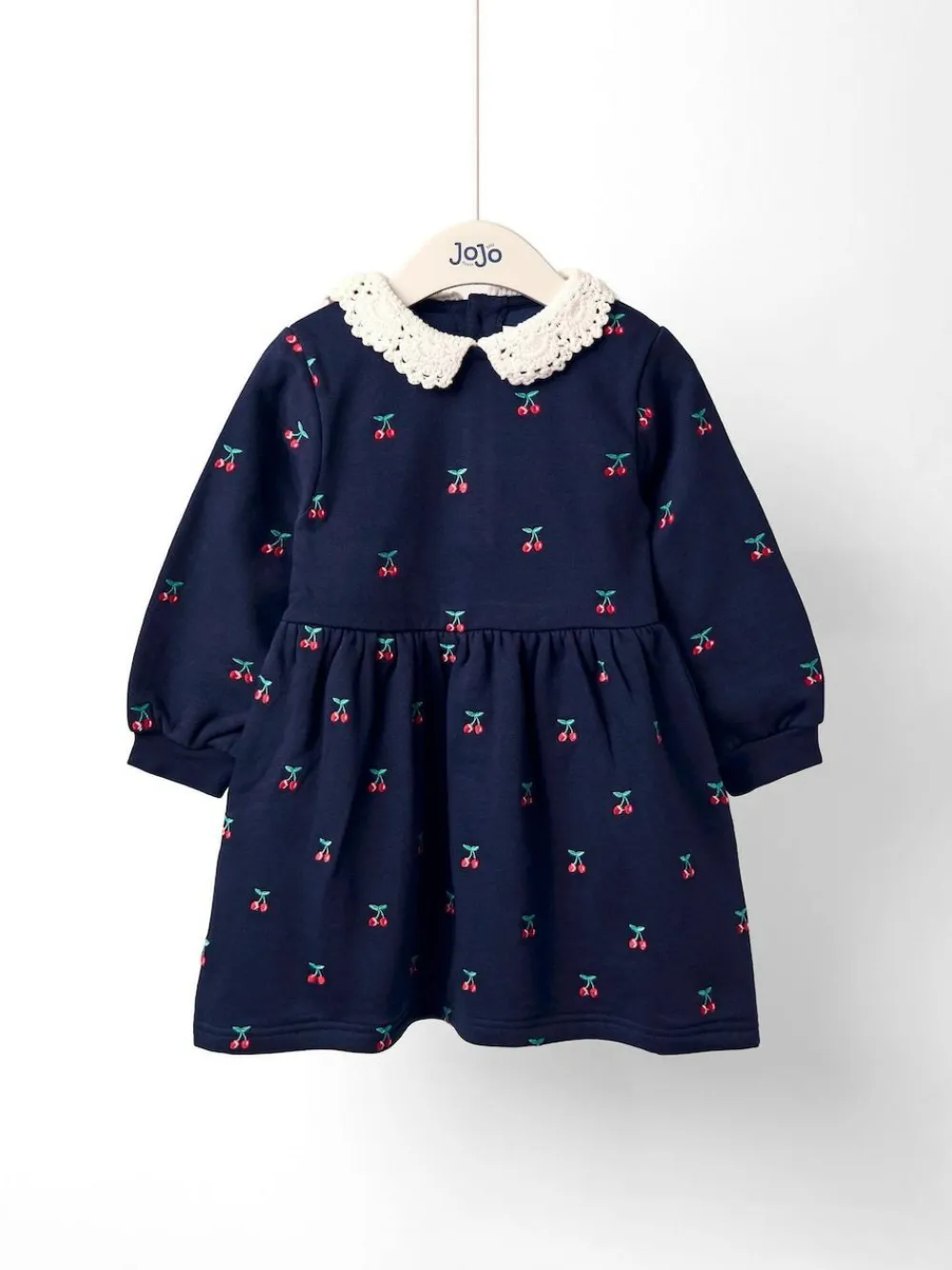 Jojo Maman Bébé Navy Blue Cherry Crochet Collar Embroidered Sweat Dress^ Dresses