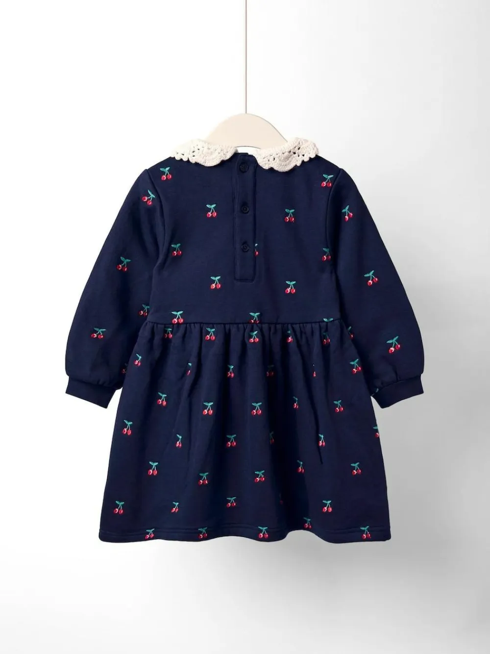 They ill look cherry-sweet every day (with an added touch of crochet) in this Embroidered Sweat Dress. Crafted from super soft and cozy navy blue jersey, this dress is sprinkled with dainty cherry embroidery, making it a top pick for days spent wandering through woodlands with berry-soaked fingers. The crochet, scalloped edge collar is just the extra detail that makes this dress a stand-out style for your little twirler. Navy blue jersey dress Long sleeves All over cherry embroidery Crochet, scalloped collar with cherries Machine washable Main 100% Cotton. Lining 100% Cotton.