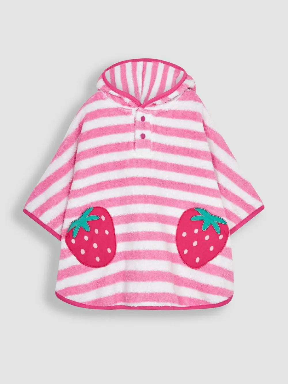 Need to dry the kids off quickly after swimming or bath time? Why not try our Towelling Poncho. Our summery Towelling Poncho comes in horizontal pastel pink and white stripes, with embroidered strawberries on the front. Thick terry material keeps them warm and cosy while they dry off. Children can pull up the hood too for an extra snug layer, while poppers near the neck and arms let kids move freely as they dry. An ideal way to make getting dressed fun! Bestselling style Practical, fun, and cosy Soft cotton towelling Embroidered strawberries Popper front neck opening Poppers to define the arms for easy movement Hood Machine washable 100% Cotton.