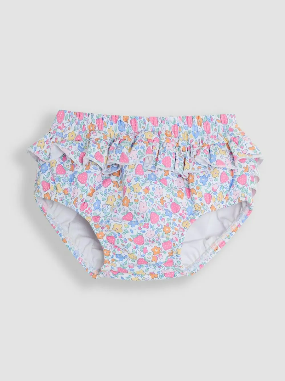 Splash and play whilst keeping little leaks at bay! If you re off to the beach or pool with your baby, then make sure you pack our Strawberry Ditsy Swim Nappy. Designed to keep accidents better contained than regular nappies without the need for another nappy underneath, it s an extremely practical solution. With pretty frills along the waistband and a ditsy floral print that looks so adorable on babies and coordinates with a selection of our other styles this season. All-over pink strawberry floral print Integral nappy: no need for disposable nappy underneath Better performing alternative to standard nappies for containing accidents Fully elasticated waist for easy dressing Machine washable Warning: Sun exposure causes skin damage Protects areas directly covered and, to a lesser extent, areas shaded from the sun Protection offered by this item may be reduced with use, or if stretched or wet Young children are particularly at risk of sunburn because of their delicate skin, babies are especially vulnerable Main 85% Recycled Nylon, 15% Elastane. Lining 95% Cotton, 5% Elastane.
