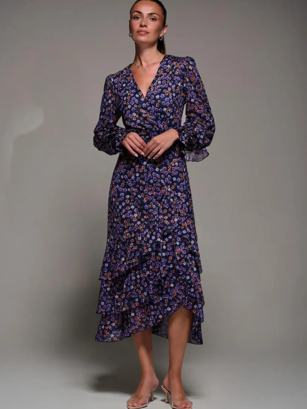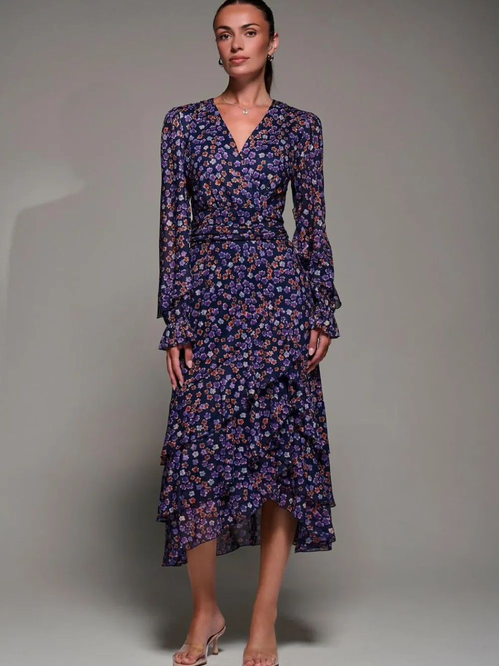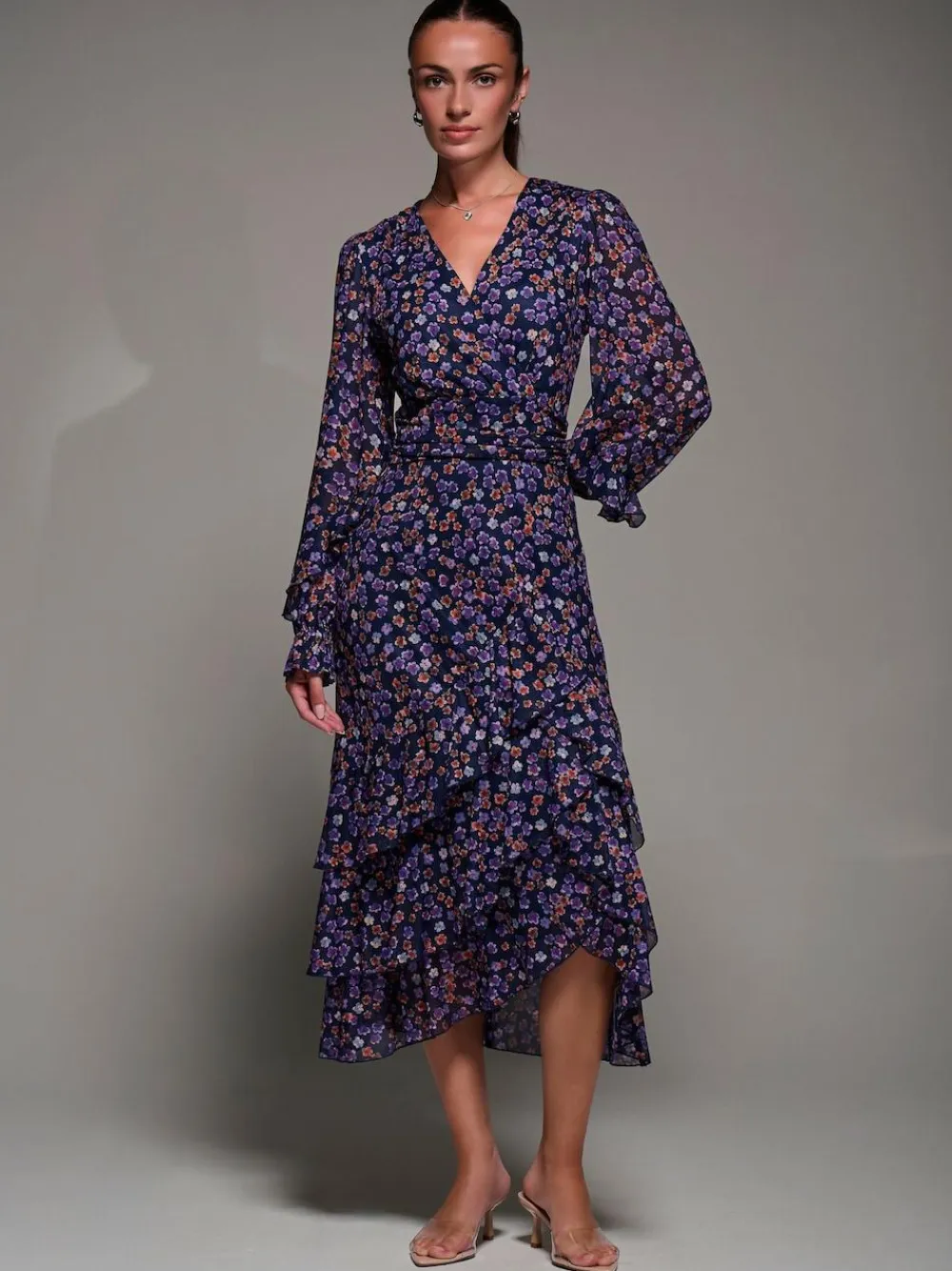 Long Sleeve Frill Detail Mesh Maxi Dress by Jolie Moi features a flattering wrap-style front with a soft V-neckline. Designed with delicate gathers at the side waistband for a beautifully draped silhouette. The skirt flows into a three-tiered frill hem with an asymmetric finish. Long sleeves are finished with elasticated cuffs that subtly flare at the wrist, adding a soft, feminine touch. Perfect for special occasions or standout evenings. Model’s height – 170cm, and wears size 8. Length – 133cm. Machine washable. 95% Polyester, 5% Elastane.
