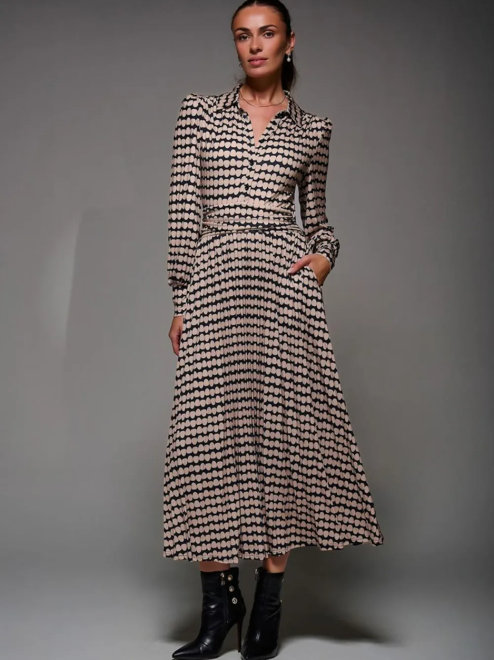 The Long Sleeve Pleated Jersey Maxi Dress by Jolie Moi. Made from soft jersey fabric, this maxi-length dress features a button-up shirt design with a structured collar neckline. It has cuffed long sleeves and a flowing pleated skirt for graceful movement. Fully lined, the dress also includes a tie detail at the back to cinch the waist, along with two discreet side pockets for practicality. Machine washable. 94% Polyester, 6% Elastane.