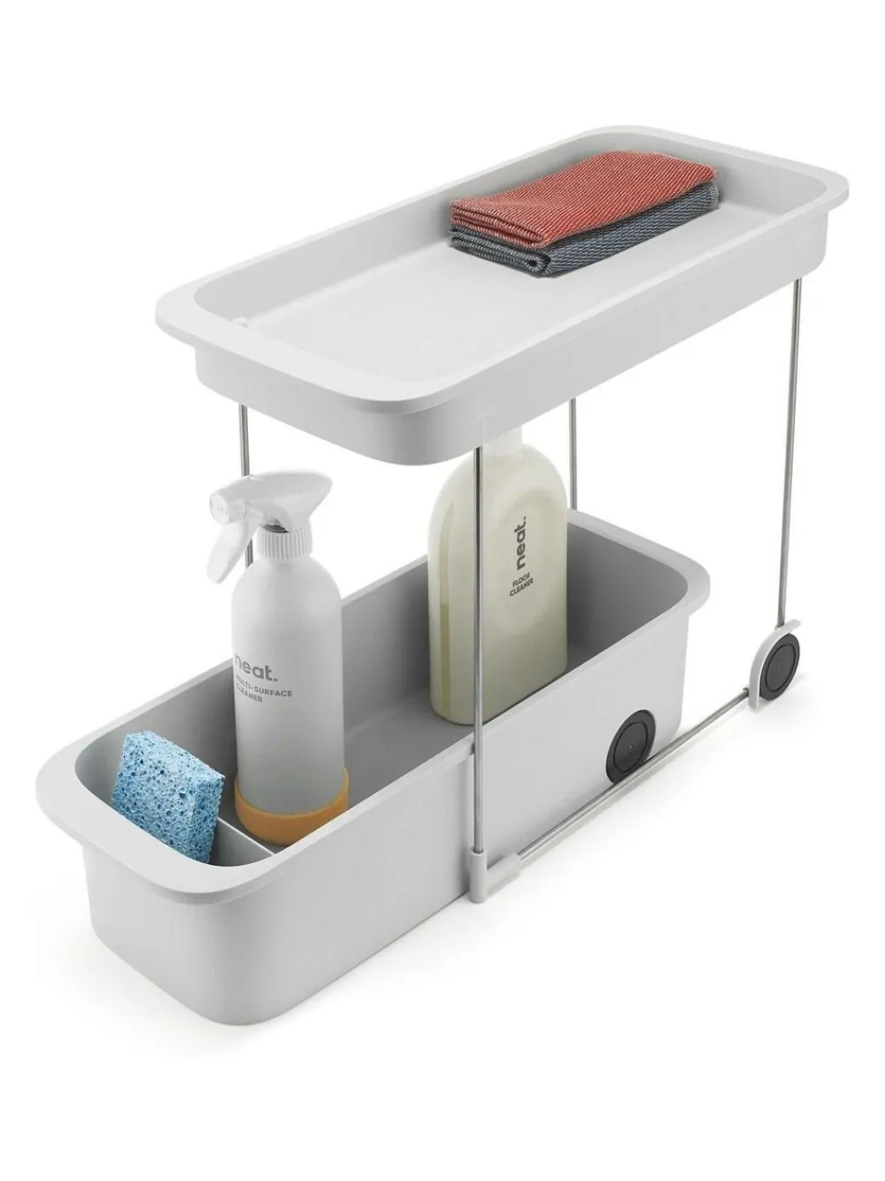 This caddy provides versatile, two-tiered storage in your cupboard for a wide variety of cleaning items. It features different compartments for optimal organisation, easy-pull handles at the front and smooth-rolling wheels on the base. Each tier can be pulled out individually making access easy, which is especially convenient when retrieving larger items. Plastic parts are Dimensions: H 34 x W 20 x D 47 cm (H 14 x W 8 x D 19 inches). Size : 0. Height 33.5cm Width 20cm Depth 47cm Hand wash only. 100% Polypropylene.